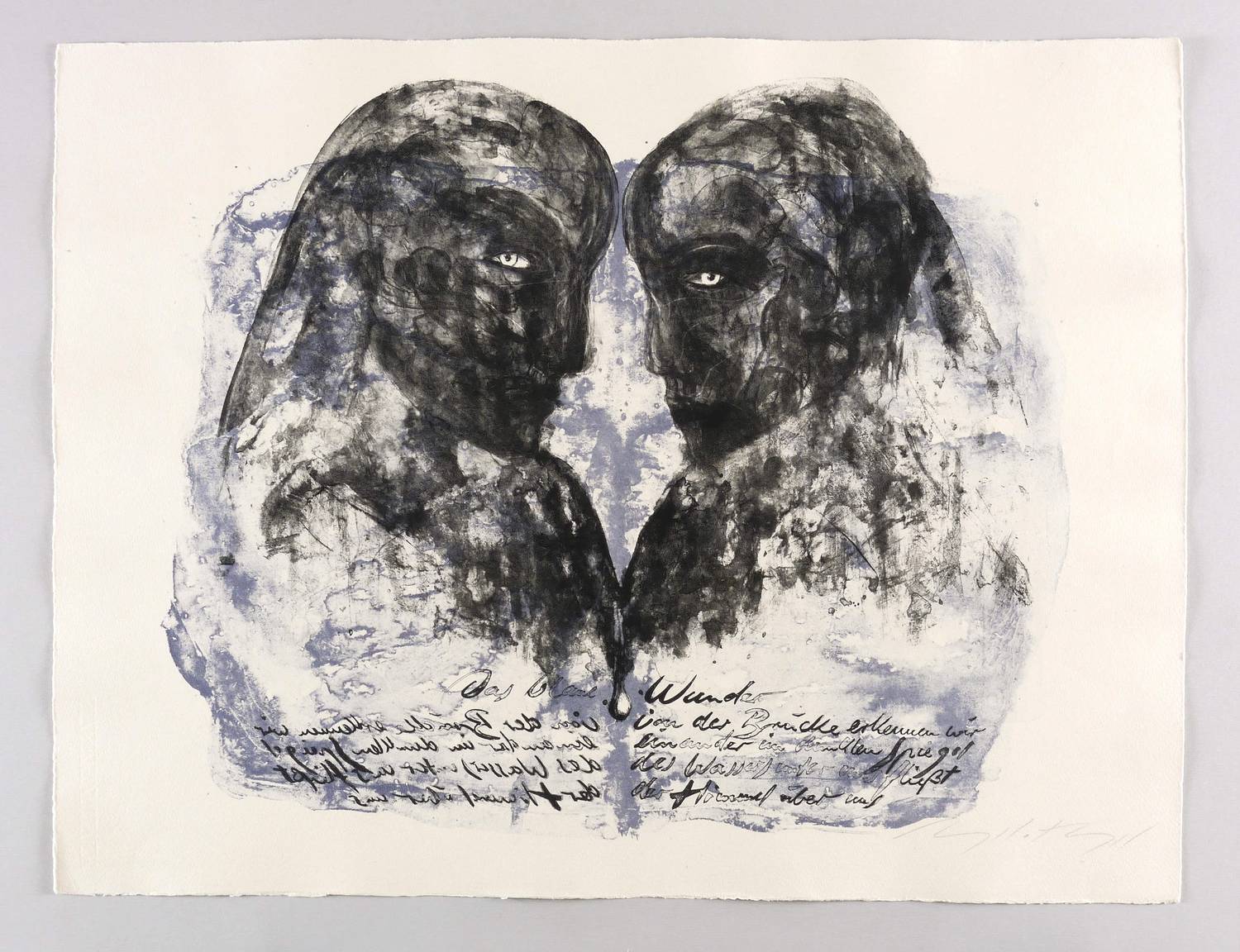 1992. Farbalgrafie / Kreide- & Pinselalgrafie, in Blaugrau & Schwarz, auf schwerem gelbem Hahnemühle. – Originale Künstlergrafik, von Angela Hampel. – 47,5 x 56,6 cm (Darstellung / Druckbild), 54 x 71 cm (Blatt).