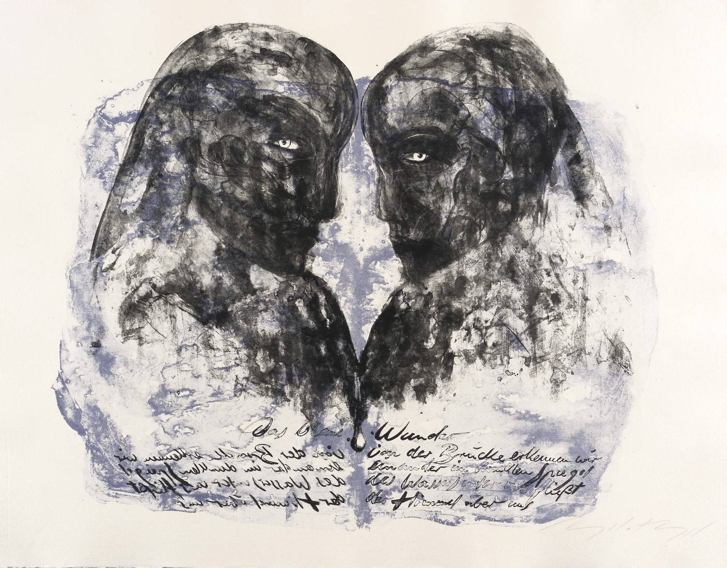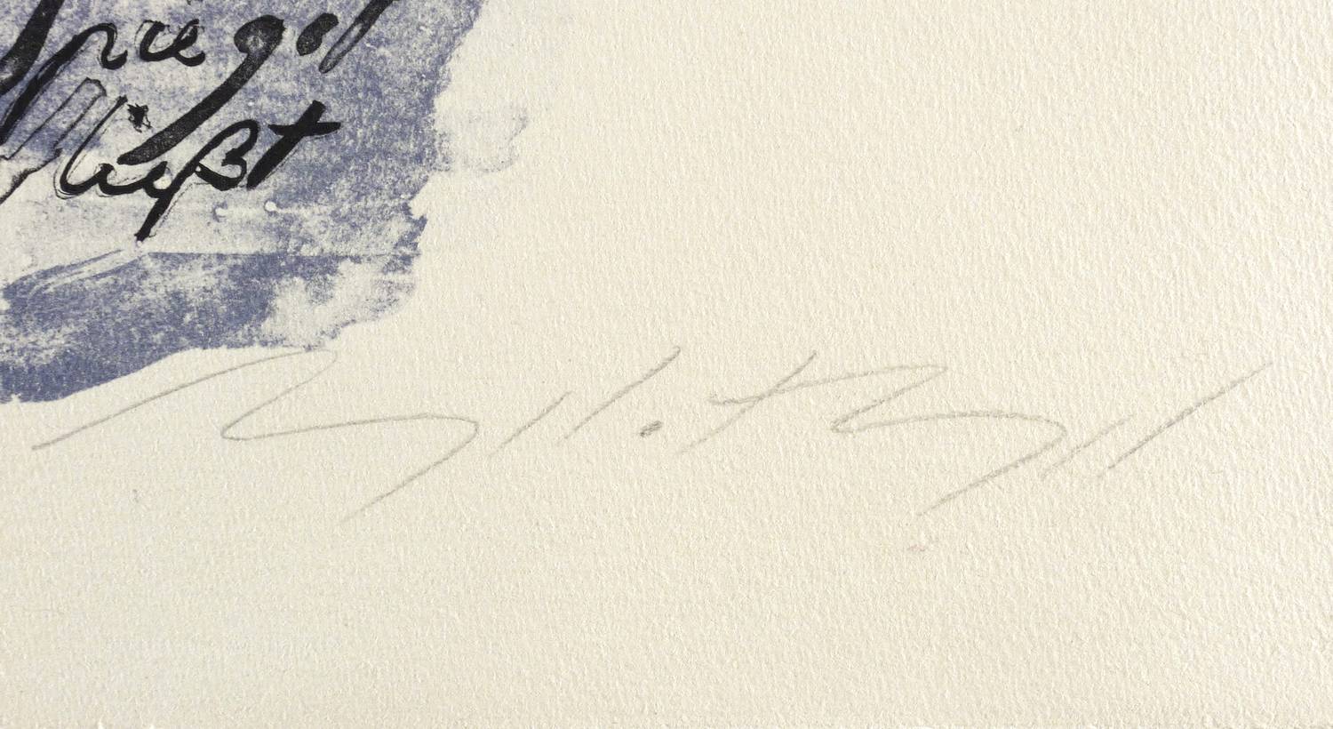 Rechts unten in Bleistift signiert: ″Angela Hampel″. In der Platte Inschrift: ″Das blaue Wunder / Von der Brücke erkennen wir / einander im dunklen Spiegel / des Wassers unter uns fließt / der Himmel über uns″. Wasserzeichen. – Zu einem Gedicht von Barbara Köhler. – Sehr guter Zustand.