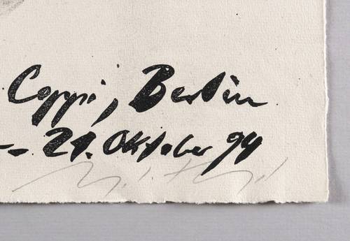Rechts unten in Bleistift signiert. Links Auflagenbezeichnung. – Originalgrafisches Künstlerplakat zur Ausstellung ″Angela Hampel″ 1994 in der Galerie Leo Coppi in Berlin. – Im oberen Rand im Bereich der Schrift rückseitig leicht durchschlagende Klebereste. Sonst keine Mängel. Mäßig guter Zustand.