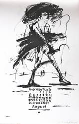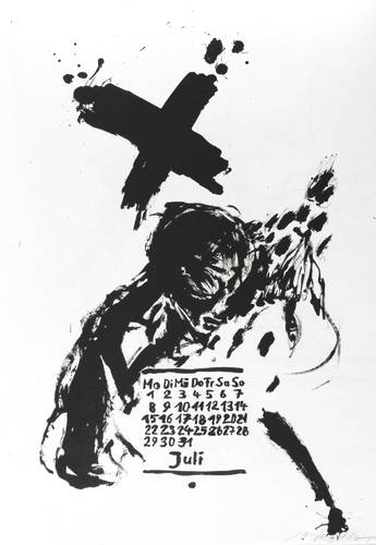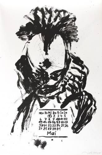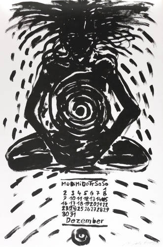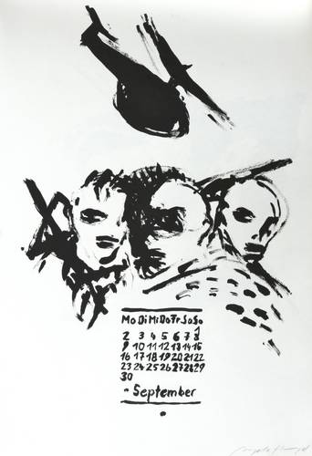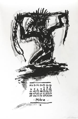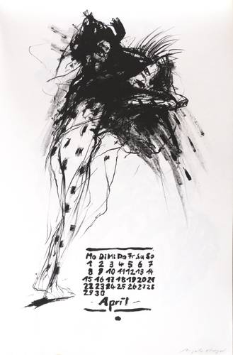 1984. Lithografie / Kreide- & Pinsellithografie, 12 Blatt, in Schwarz, auf hellem leichtem Velin. – Originalgrafischer Kalender, von Angela Hampel. – Auflage Exemplar Nr. 1/30. – 46,5 x 30,0 cm (Blätter).
