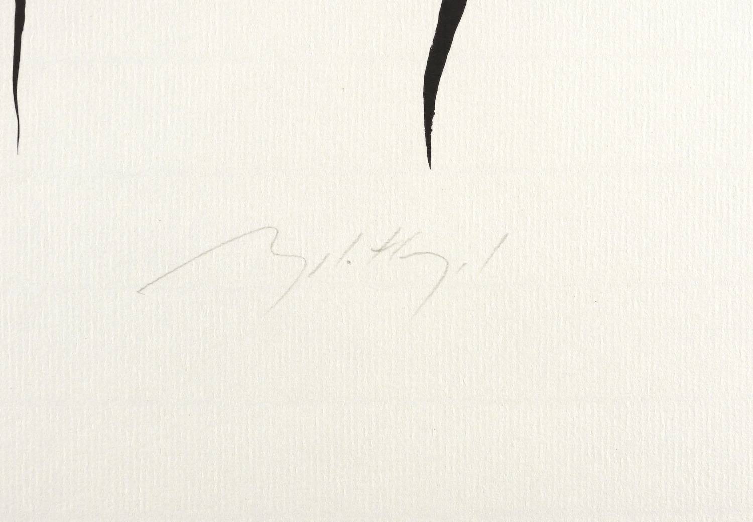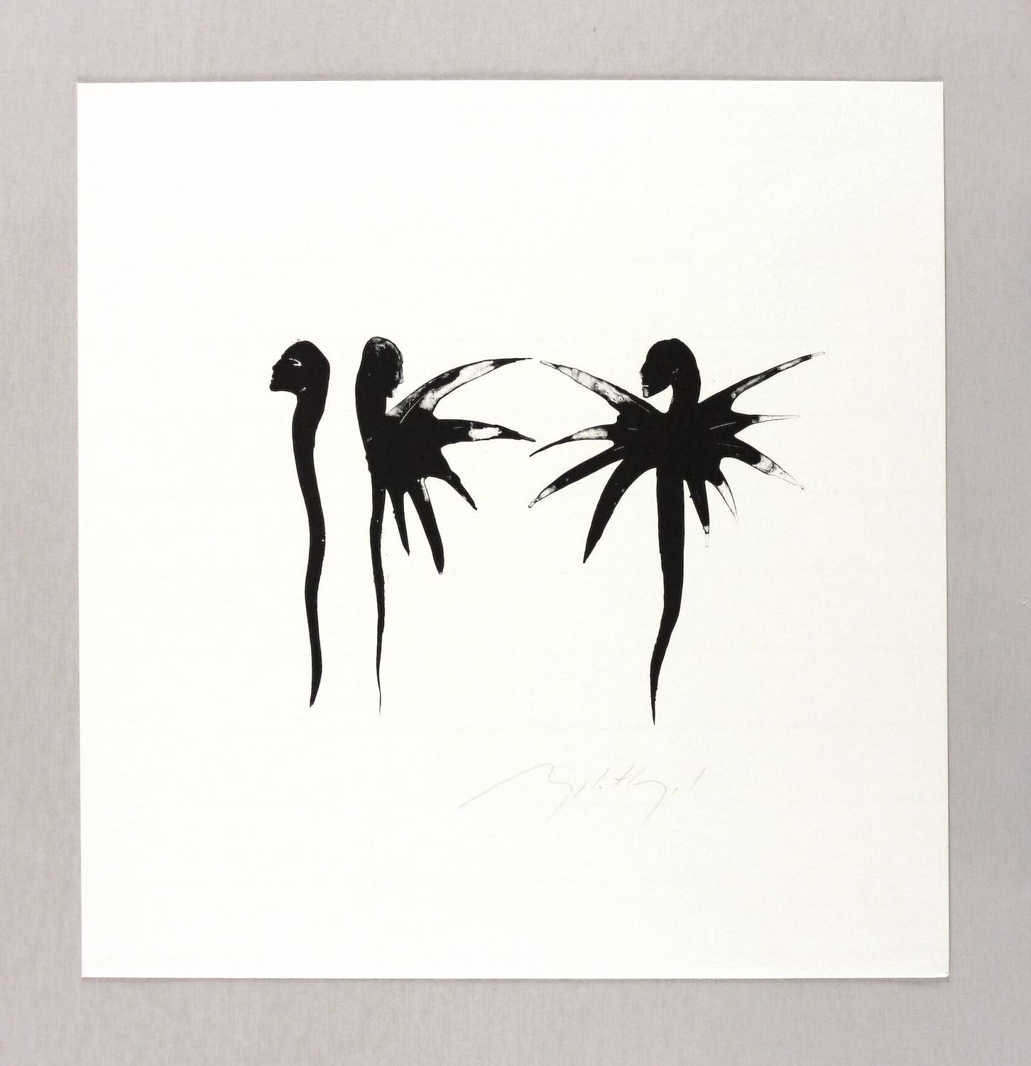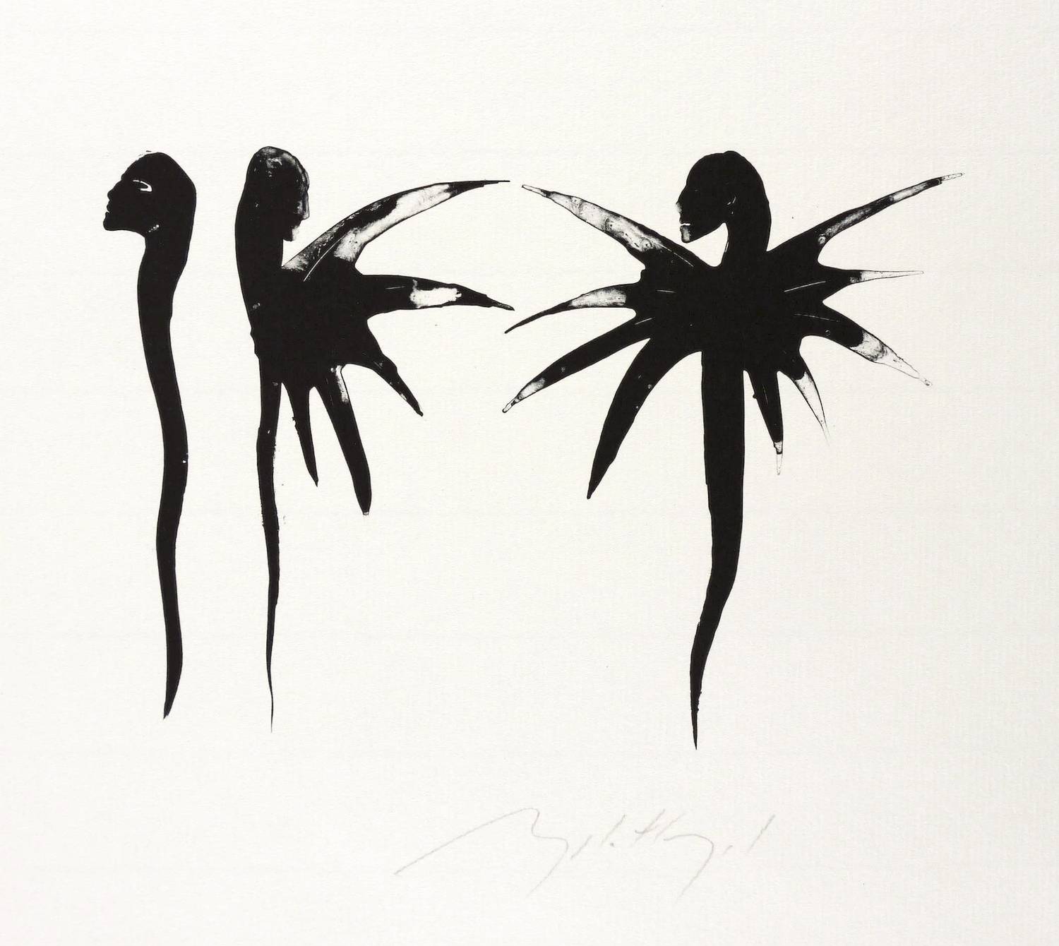 1998. Algrafie / Pinselalgrafie, in Schwarz, auf leichtem hellgelbem Maschinenbütten. – Originale Künstlergrafik, von Angela Hampel. – Auflage 120 Exemplare. – 13,5 x 19,3 cm (Darstellung / Druckbild), 31 x 30 cm (Blatt).
