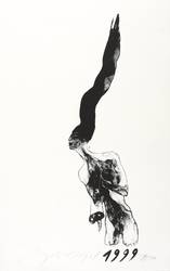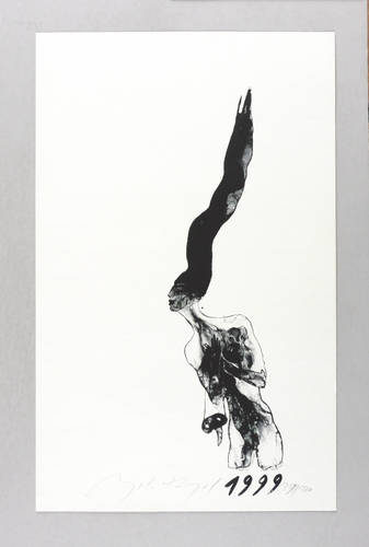 1999. Algrafie / Pinselalgrafie, in Schwarz, auf leichtem hellgelbem Maschinenbütten. – Originale Künstlergrafik, von Angela Hampel. – Auflage Exemplar Nr. 119/120. – 38,4 x 11,5 cm (Darstellung / Druckbild), 48 x 30 cm (Blatt).