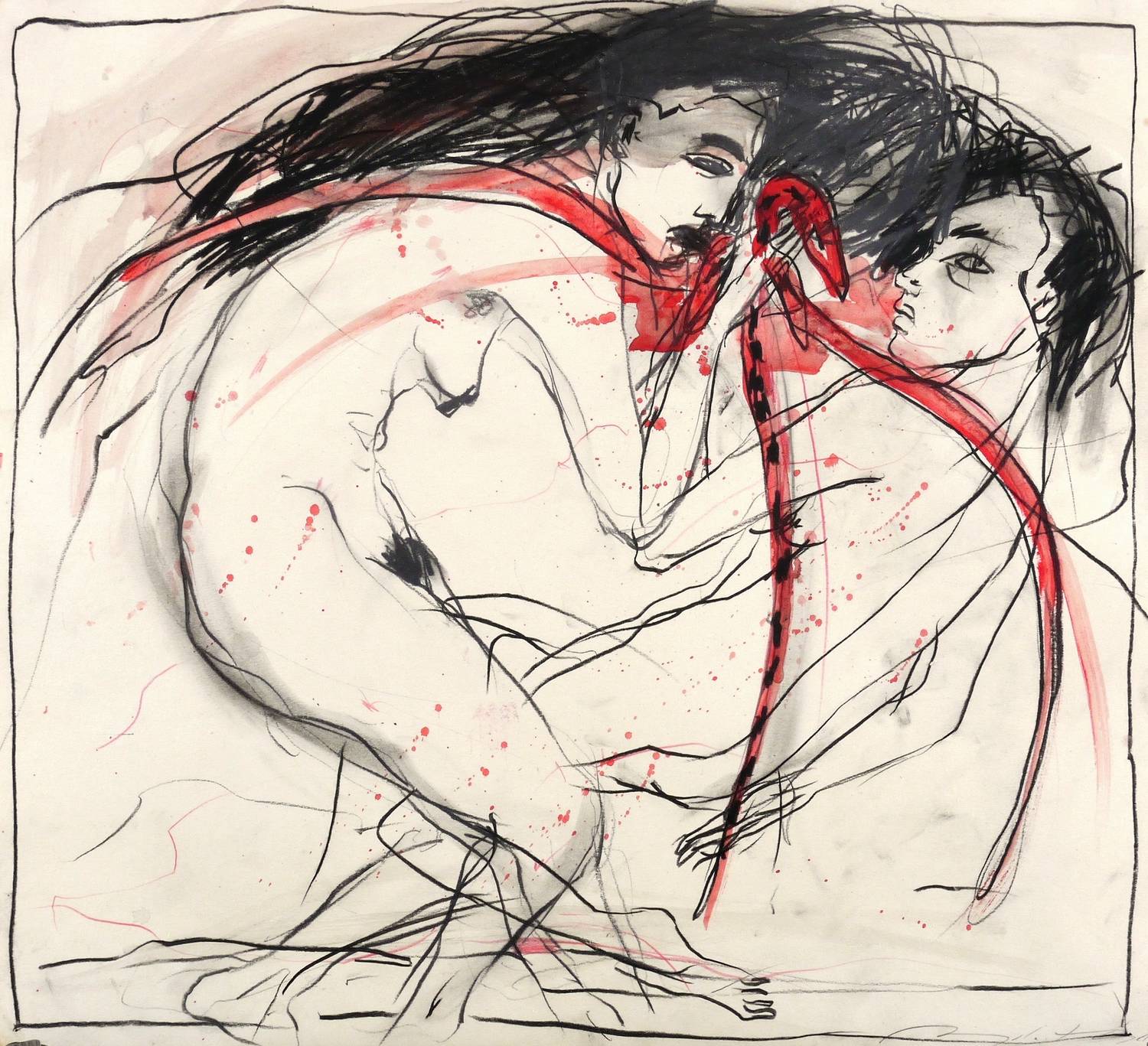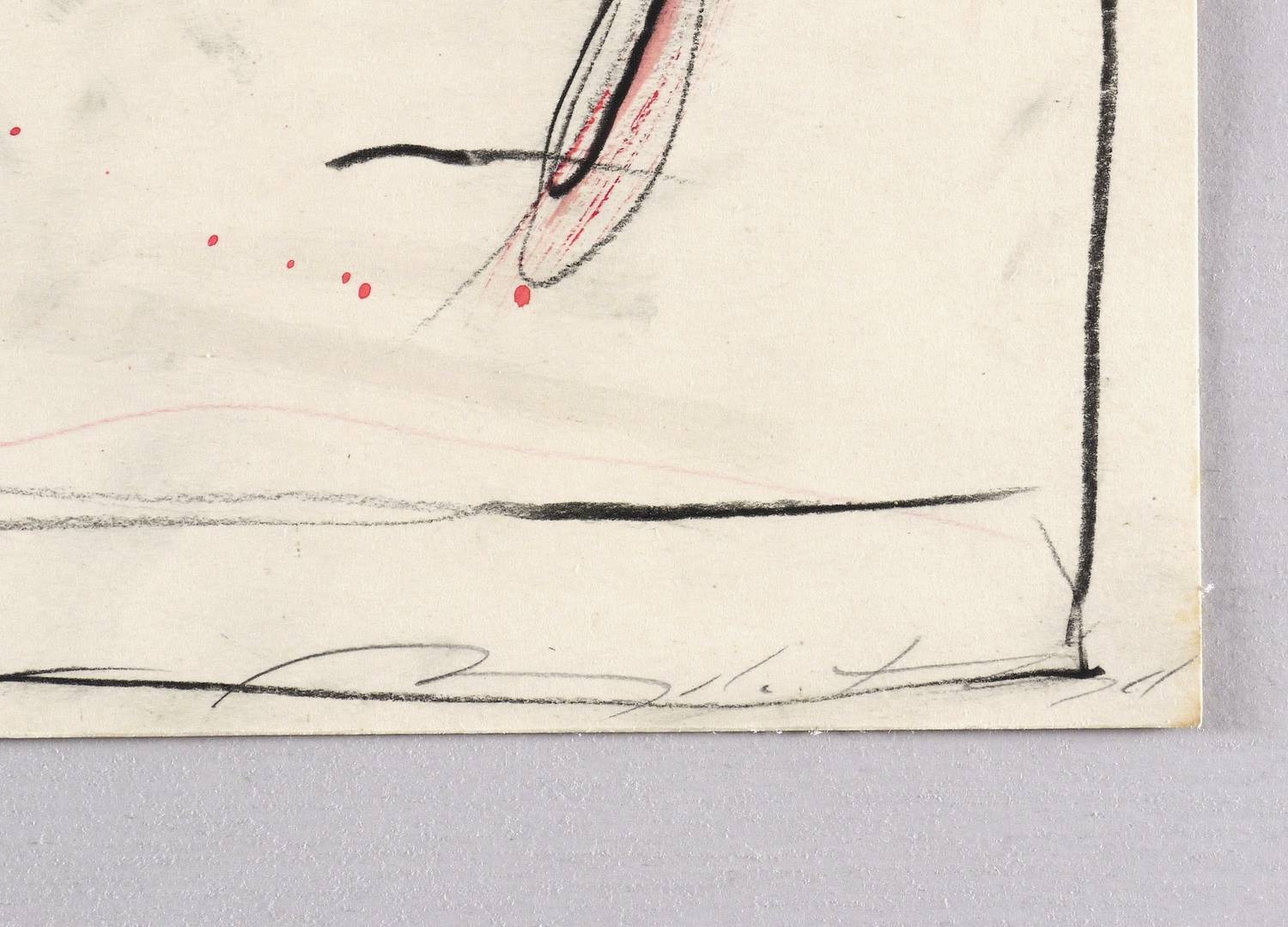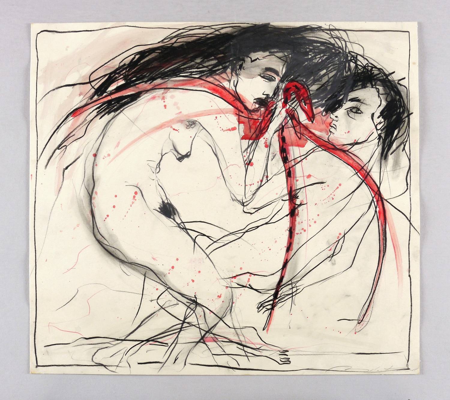 Um 1995. Zeichnung / Fettkreide & Aquarell, partiell gewischt, in Schwarz & Rot, auf hartem chamois Velinkarton. – Originale Künstlergrafik, von Angela Hampel. – Unikat. – 37,0 x 40,5 cm (Darstellung / Blatt).