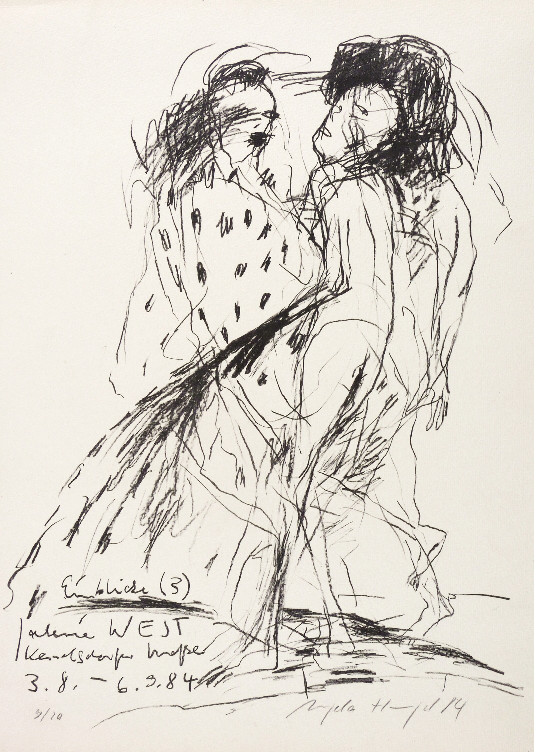 Rechts unten in Bleistift signiert und datiert: ″Angela Hampel 84″. Links Auflagenbezeichnung: ″9/20″. Diverse Inschriften. – Originalgrafisches Künstlerplakat zur Ausstellung ″Einblicke 3″ in der Galerie West in Dresden 3.8.-6.9.1984. – Provenienz: Sammlung Gerlint Söder und Erhard Frommhold, Dresden. – Sehr guter Zustand.