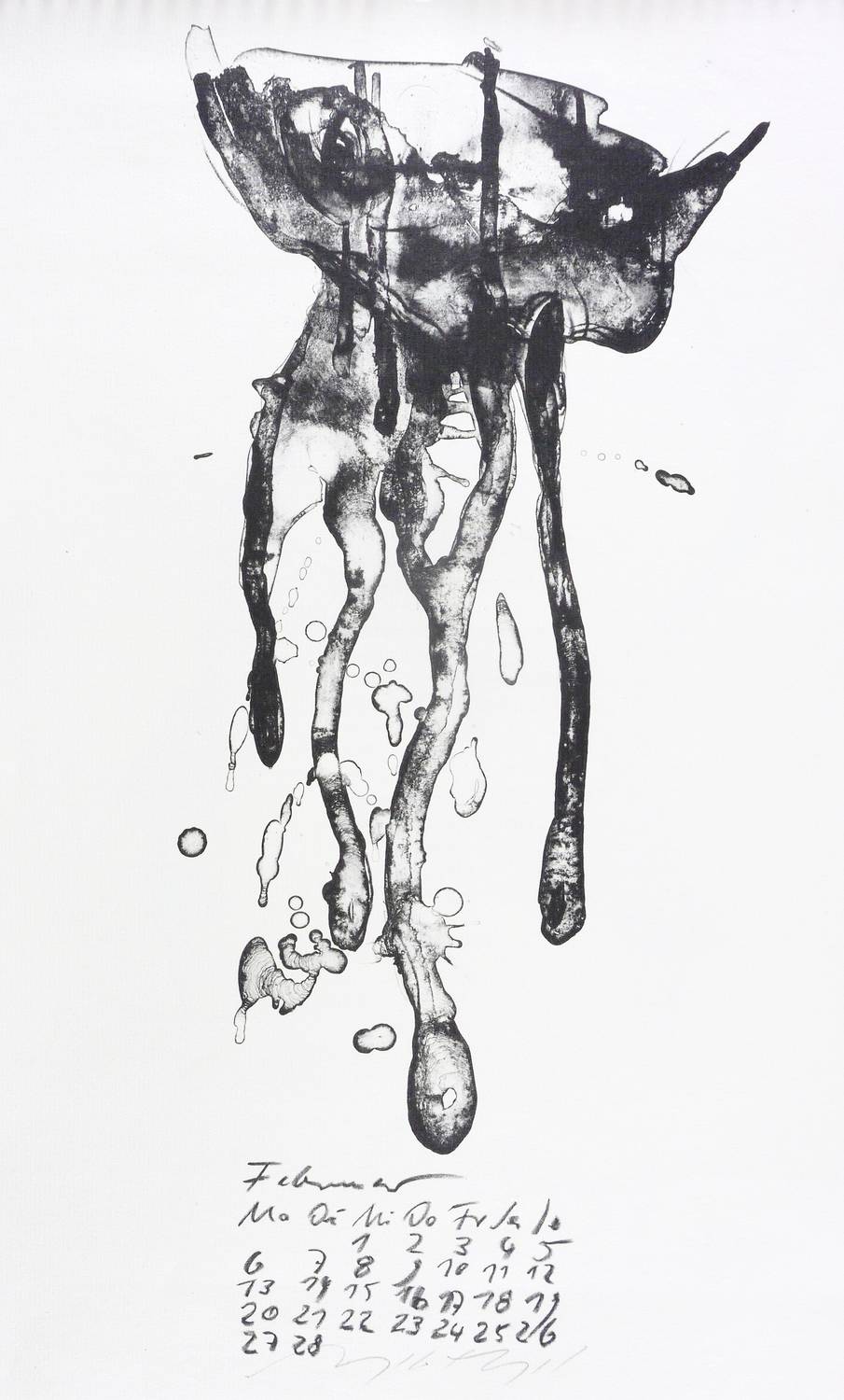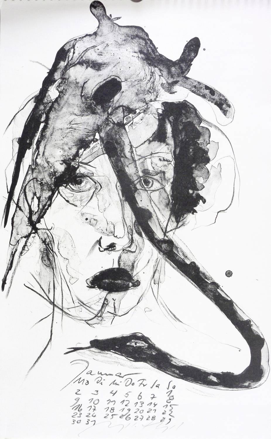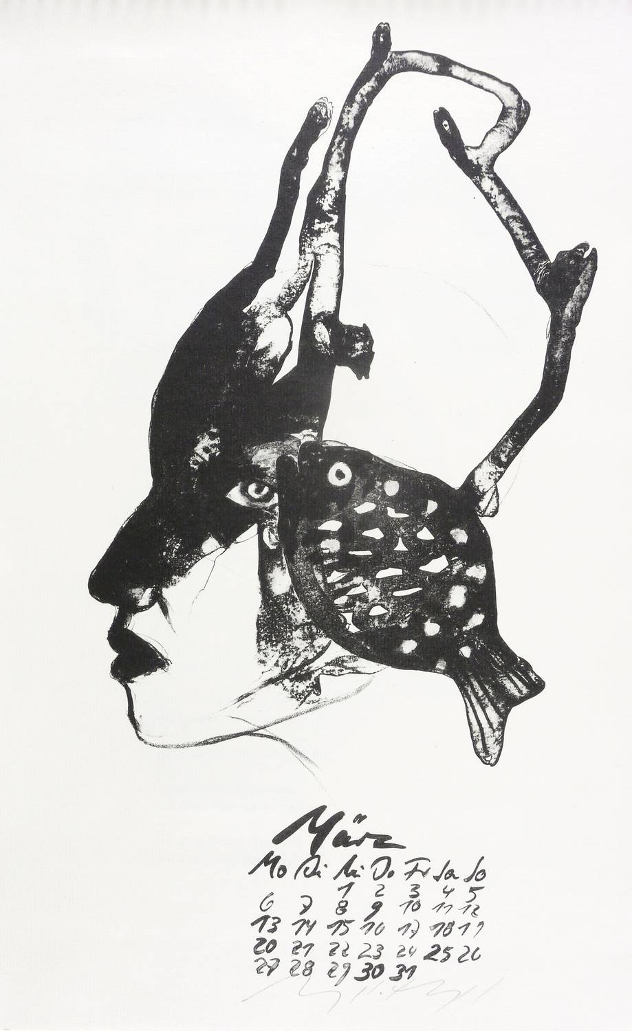 1994. Originaloffset / Kreide & Pinsel, 12 Blatt, in Schwarz, auf hellchamois Maschinenbütten. – Originalgrafischer Kalender, von Angela Hampel. – Auflage Exemplar Nr. 91/120. – 49,0 x 30,0 cm (Blätter).