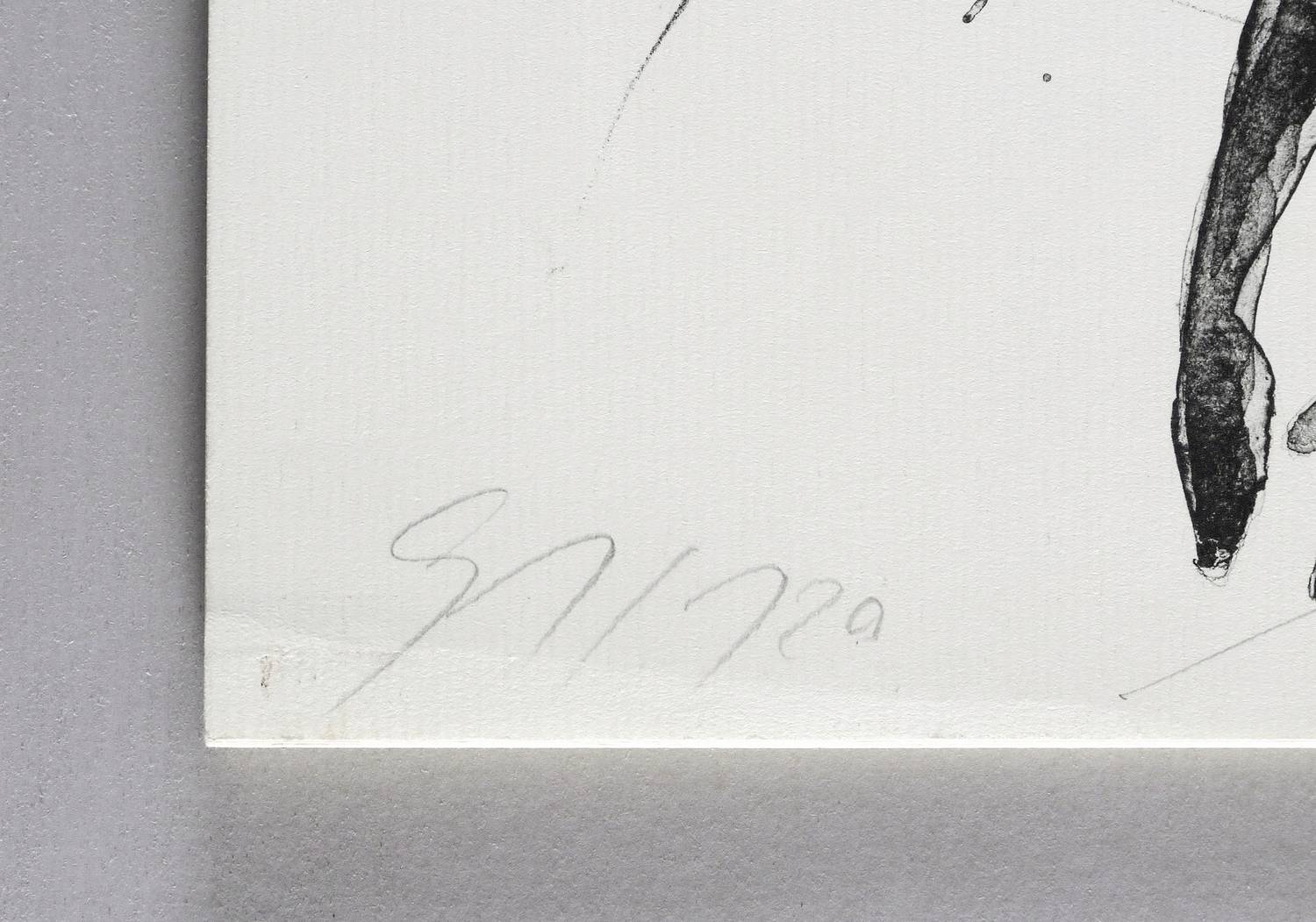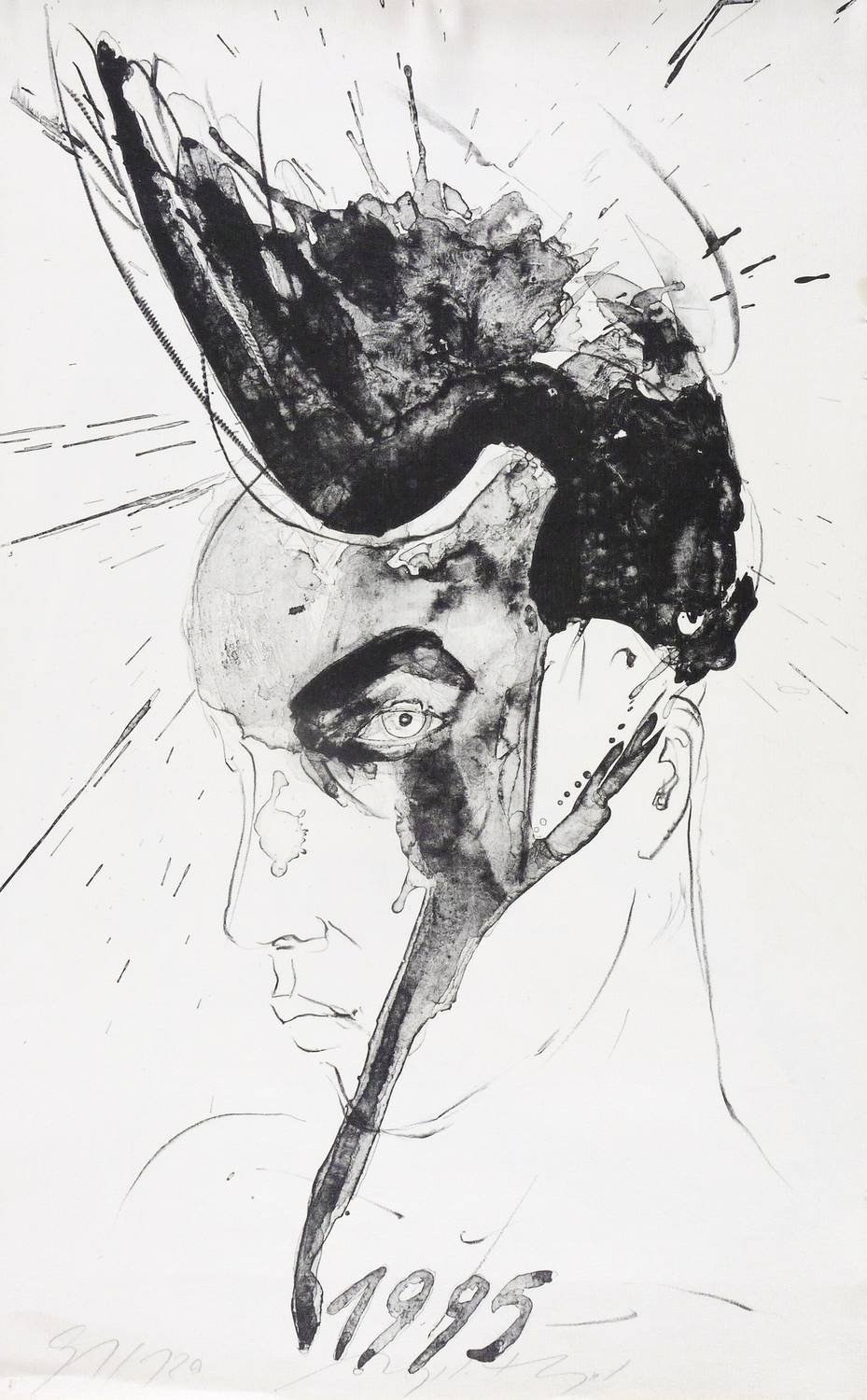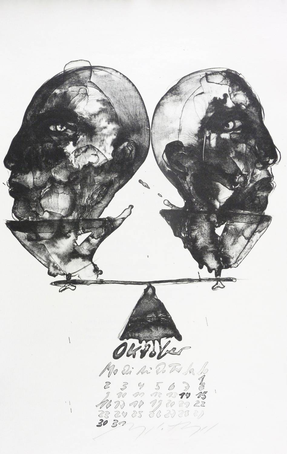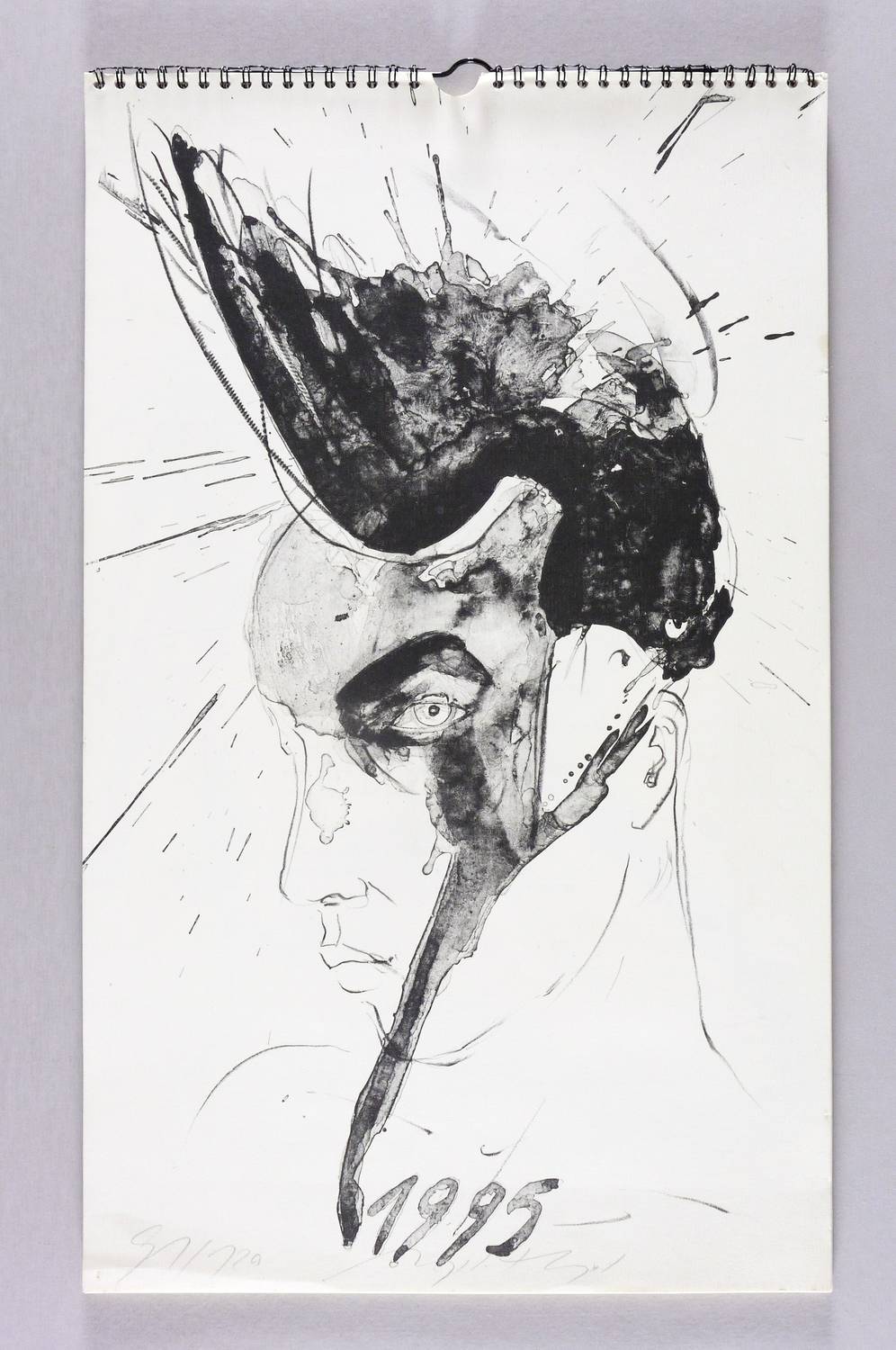1994. Originaloffset / Kreide & Pinsel, 12 Blatt, in Schwarz, auf hellchamois Maschinenbütten. – Originalgrafischer Kalender, von Angela Hampel. – Auflage Exemplar Nr. 91/120. – 49,0 x 30,0 cm (Blätter).