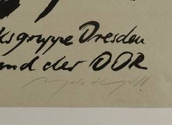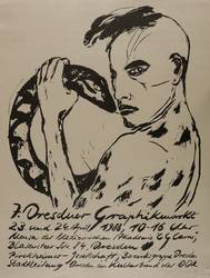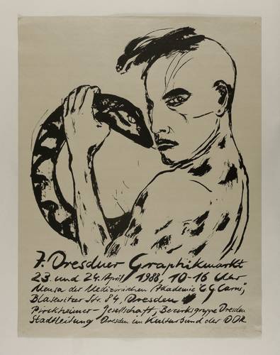 Rechts unten in Bleistift signiert und datiert: ″Angela Hampel 88″. Ohne Auflagenbezeichnung. Diverse Inschriften. – Originalgrafisches Künstlerplakat zum 7. Graphikmarkt in Dresden am 23./24.4.1988 in der Mensa der Medizinischen Akademie Carl Gustav Carus in Dresden. – In den Blattecken Reißzwecklöchlein. Guter Zustand.