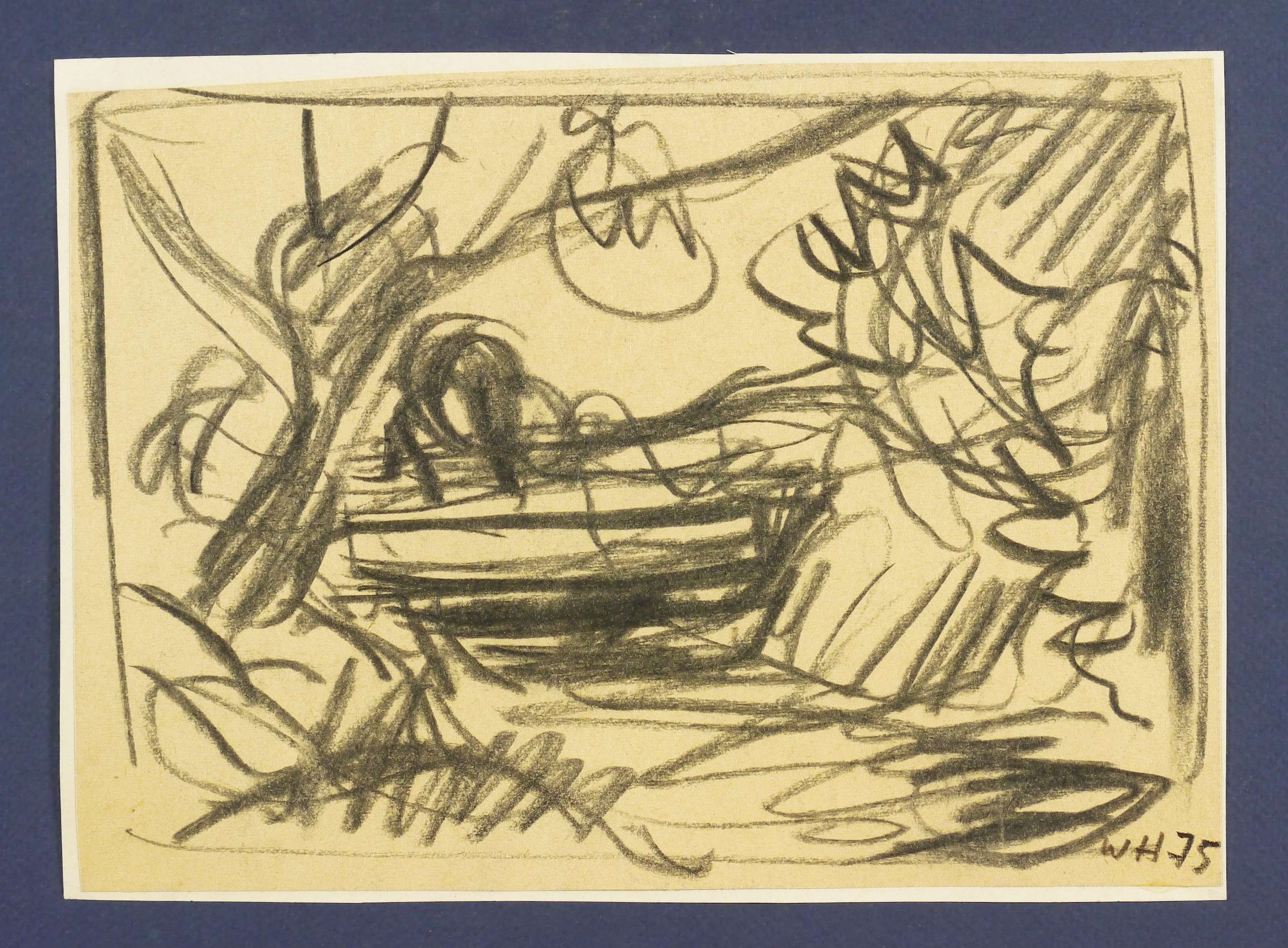 1975. Zeichnung / Kohlezeichnung, auf Papier. – Originale Künstlergrafik, von Werner Haselhuhn. – Unikat. – 18,0 x 24,5 cm (Darstellung / Blatt).