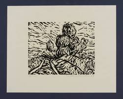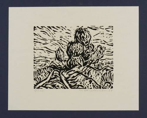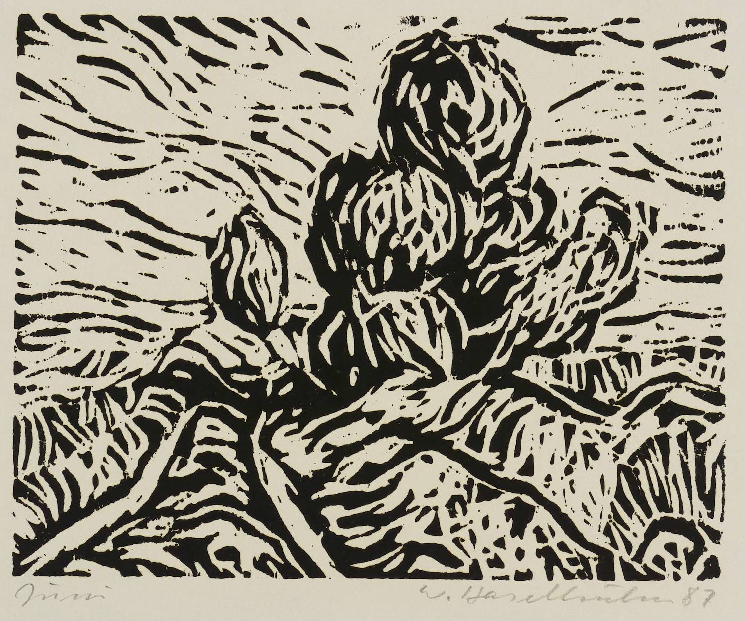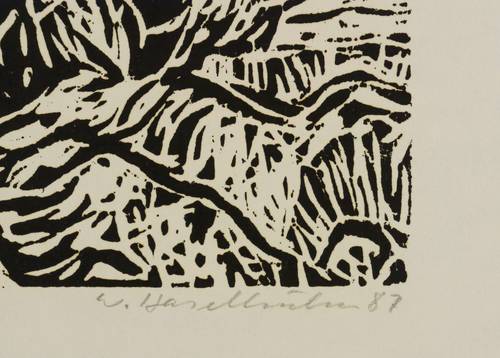 1987. Holzschnitt, in Schwarz, auf hellgelbem Maschinenbütten. – Originale Künstlergrafik, von Werner Haselhuhn. – 14,0 x 18,0 cm (Darstellung / Druckstock), 24 x 30 cm (Blatt).