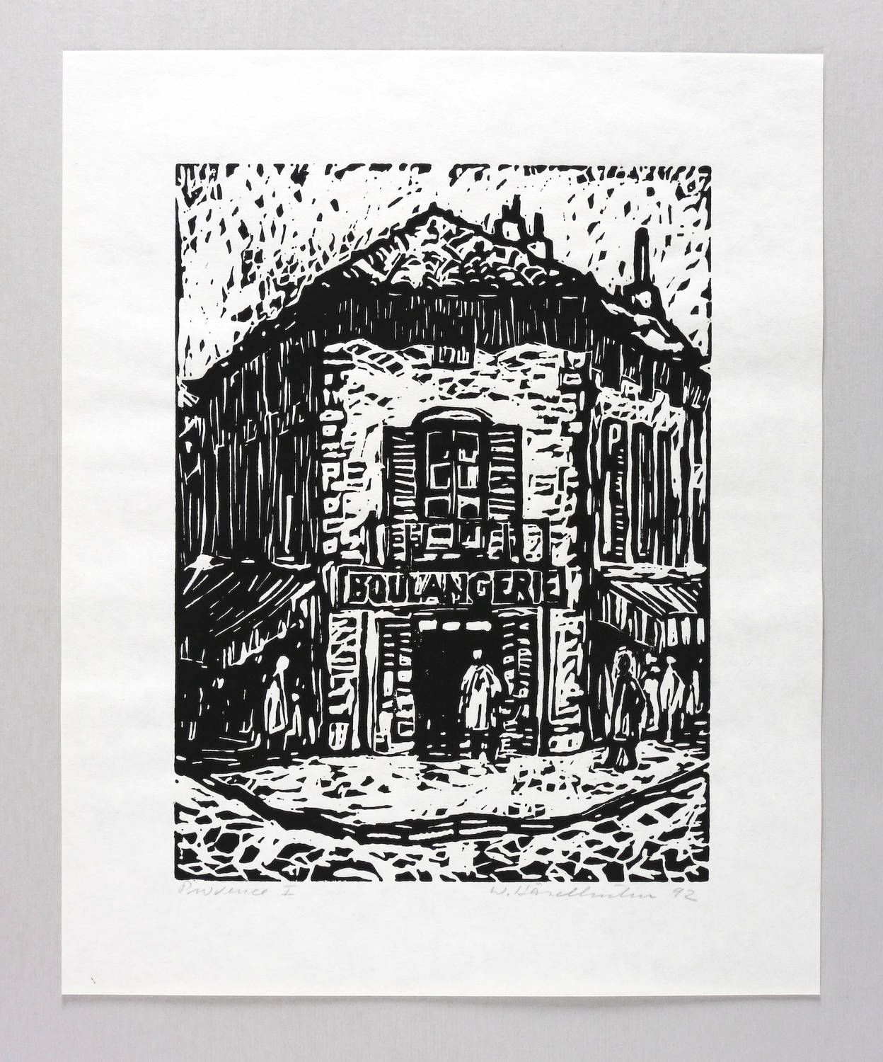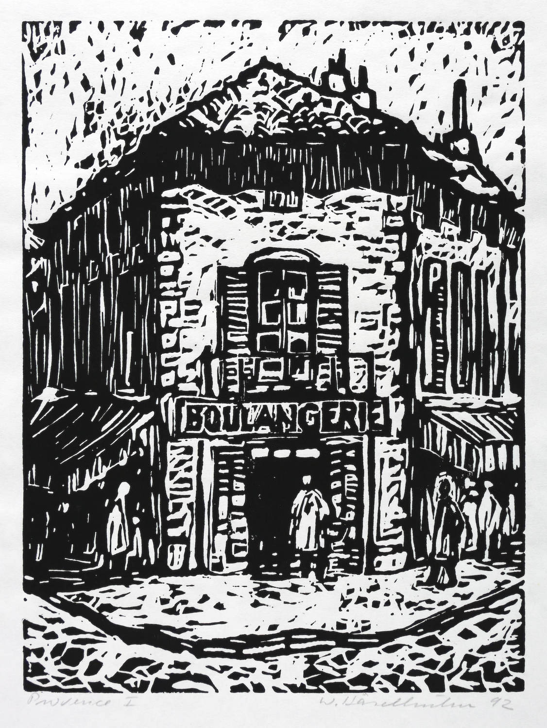 Rechts unten in Bleistift signiert und datiert: ″W. Haselhuhn 92″. Links betitelt: ″Provence I″. – Aus einer Holzschnitt-Folge zur Provence. – Sehr gutes Exemplar.