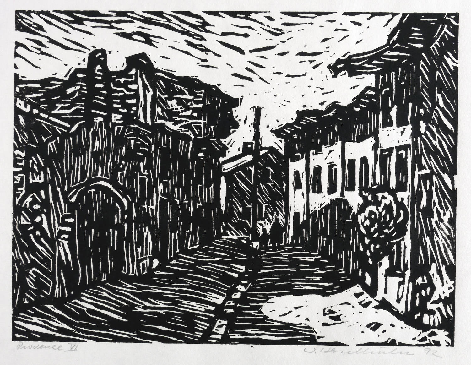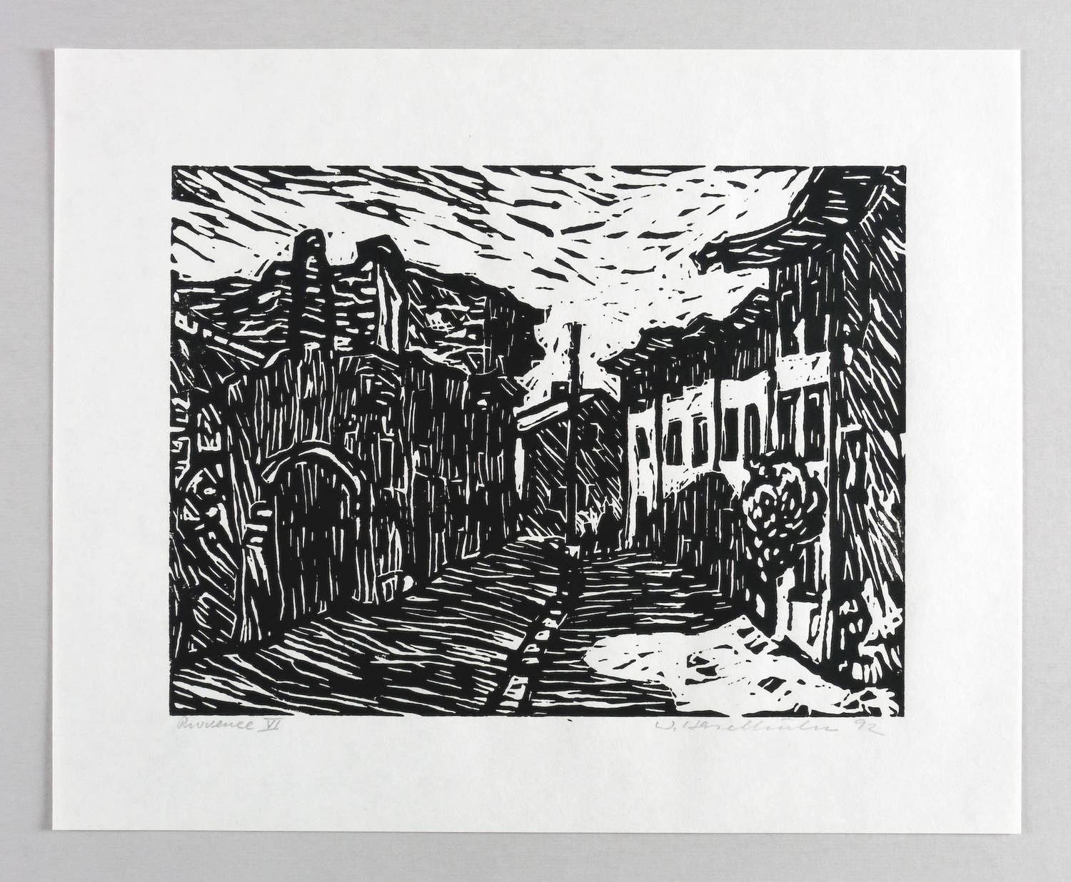 Rechts unten in Bleistift signiert und datiert: ″W. Haselhuhn 92″. Links betitelt: ″Provence VI″. – Aus einer Holzschnitt-Folge zur Provence. – Sehr gutes Exemplar.