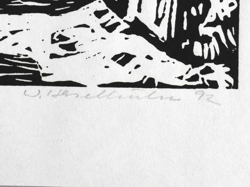 1992. Holzschnitt, in Schwarz, auf hellem Japanpapier. – Originale Künstlergrafik, von Werner Haselhuhn. – 24,1 x 32,1 cm (Darstellung / Druckstock), 35 x 43 cm (Blatt).