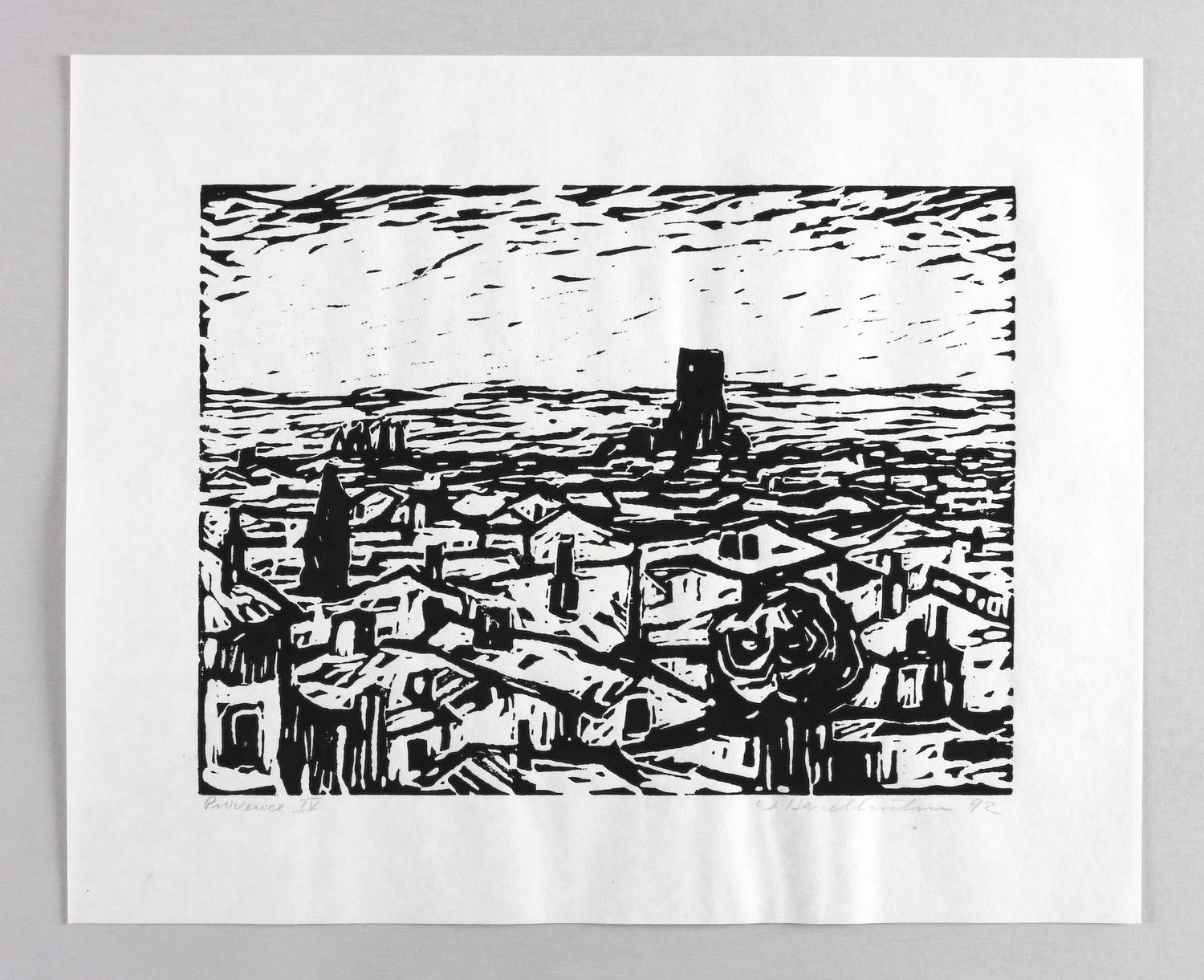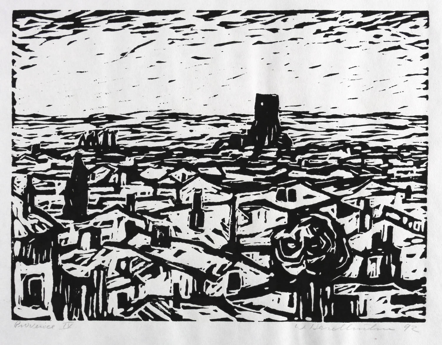 Rechts unten in Bleistift signiert und datiert: ″W. Haselhuhn 92″. Links betitelt: ″Provence IV″. – Aus einer Holzschnitt-Folge zur Provence. – Sehr gutes Exemplar.