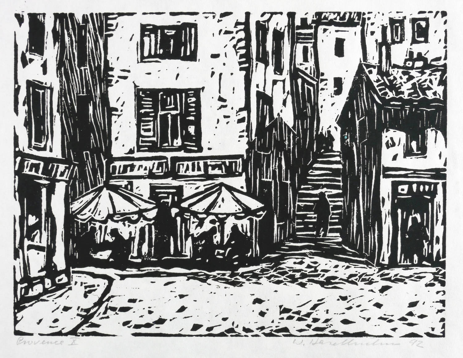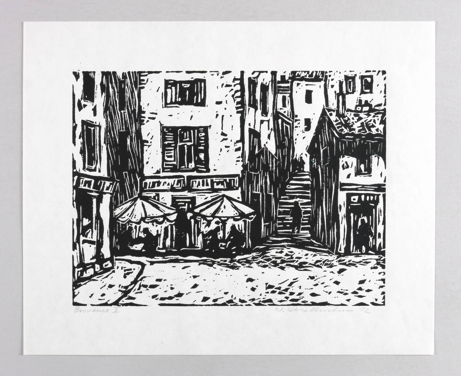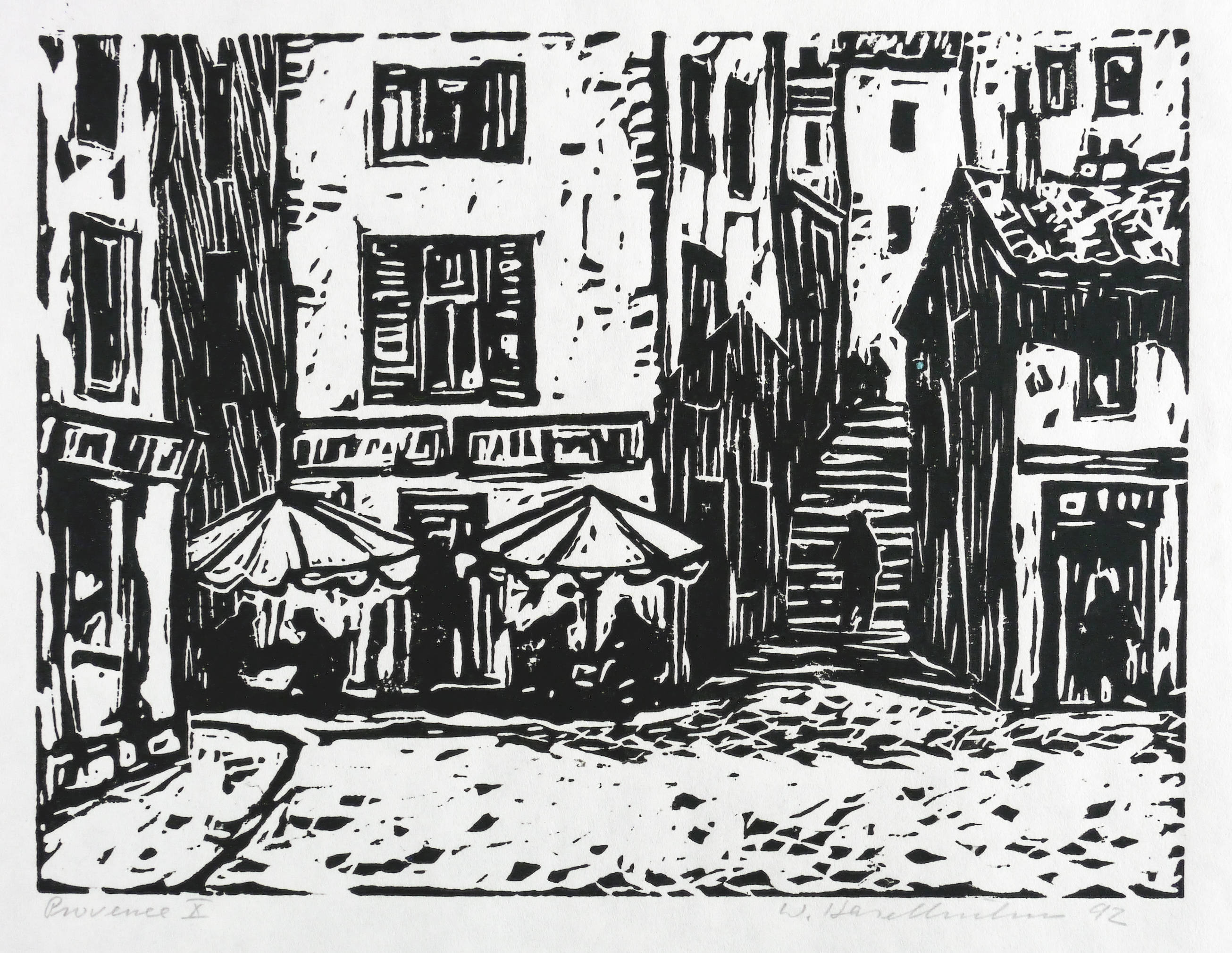 Rechts unten in Bleistift signiert und datiert: ″W. Haselhuhn 92″. Links betitelt: ″Provence X″. – Aus einer Holzschnitt-Folge zur Provence. – Sehr gutes Exemplar.