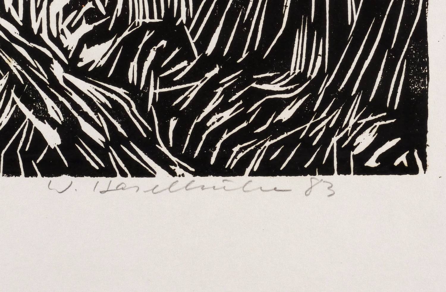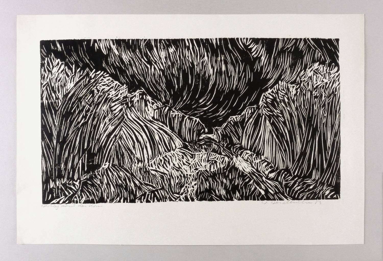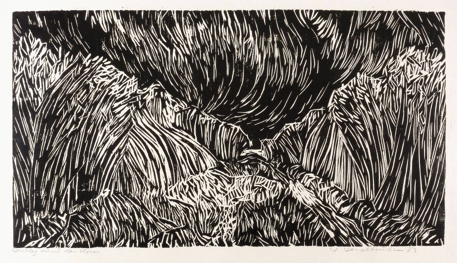 1983. Holzschnitt, in Schwarz, auf hellgelbem Velin. – Originale Künstlergrafik, von Werner Haselhuhn. – 36,0 x 65,5 cm (Darstellung / Druckbild), 51 x 76 cm (Blatt).