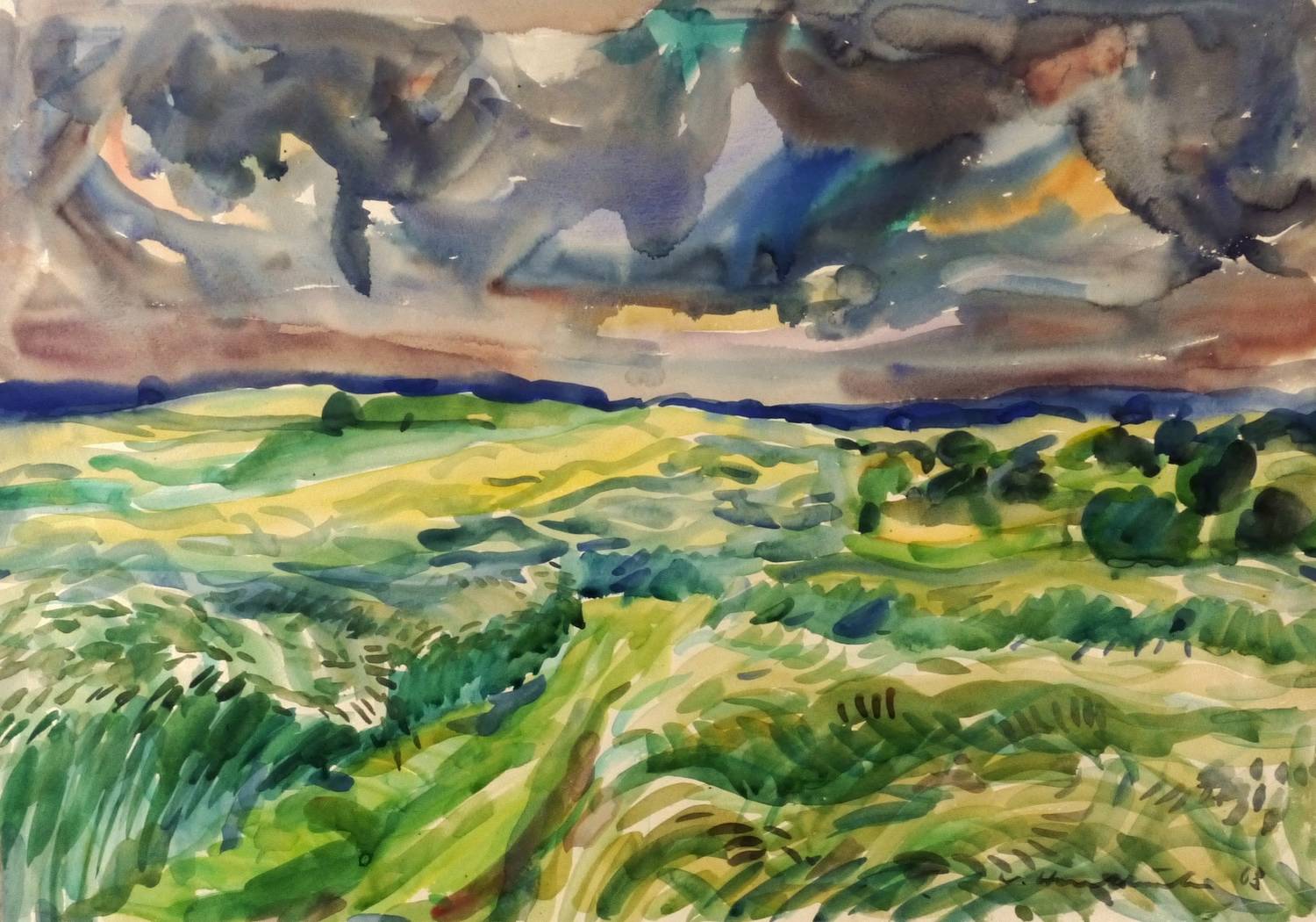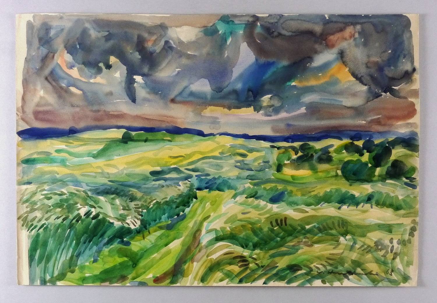 Rechts unten mit Pinsel signiert und datiert: ″W. Haselhuhn 68″. Verso zweimal in Bleistift und Kugelschreiber betitelt: ″Grüne Kornfelder mit Regenhimmel // Grüne Kornfelder im Wind″. – Umlaufend leichte Randmängel. Mäßig guter Zustand.