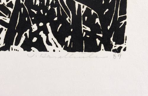 1969. Holzschnitt, in Schwarz, auf hellchamois Velin. – Originale Künstlergrafik, von Werner Haselhuhn. – Auflage Exemplar Nr. 5/10. – 27,5 x 27,0 cm (Darstellung / Druckbild), 36 x 35 cm (Blatt).