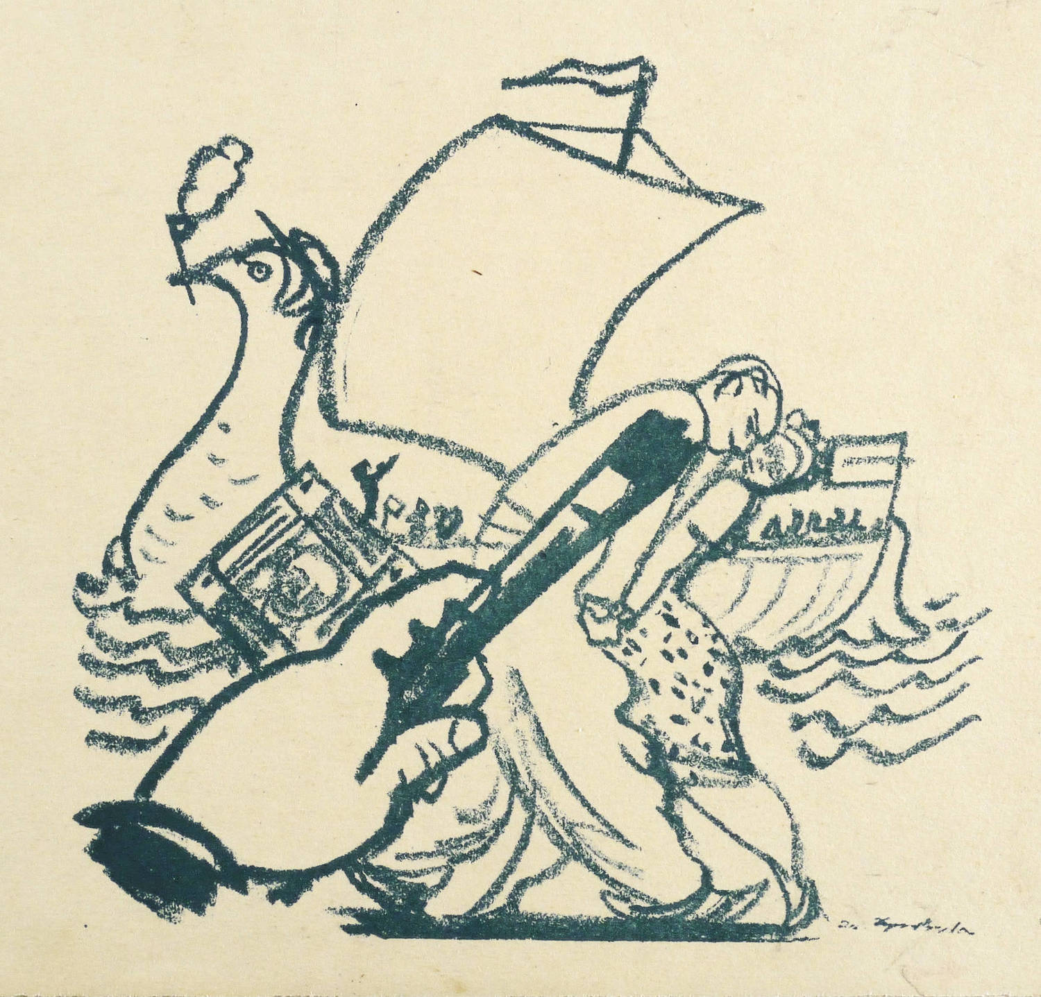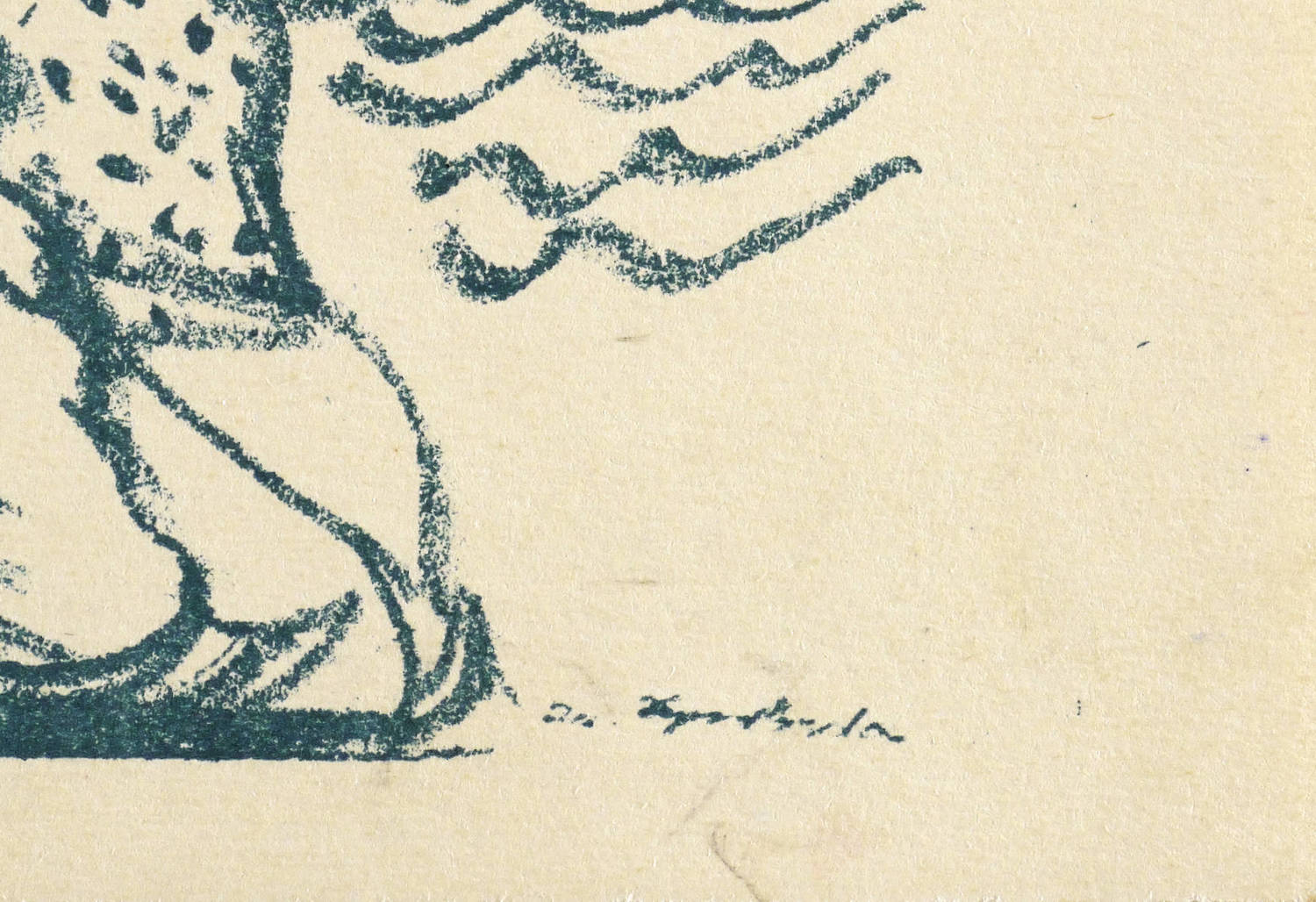 1950-1960. Lithografie / Kreidelithografie, in Blaugrün, auf gelbem Velin. – Originale Künstlergrafik, von Josef Hegenbarth. – 14,9 x 15,6 cm (Darstellung / Druckbild), 18 x 21 cm (Blatt).