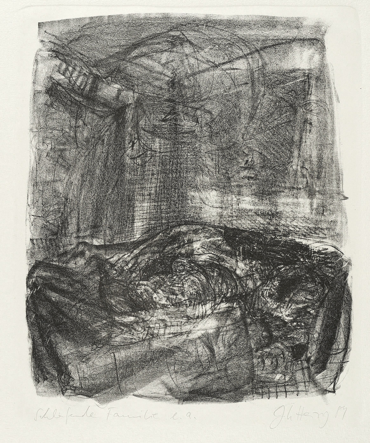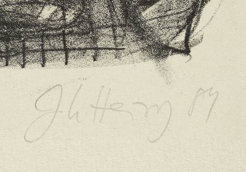 1989. Lithografie / Kreidelithografie, in Schwarz, auf Hahnemühle. – Originale Künstlergrafik, von Johannes Heisig. – Künstlerexemplar (e.a.). – 29,5 x 25,0 cm (Darstellung), 32,0 x 26,0 cm (Stein), 53 x 40 cm (Blatt).