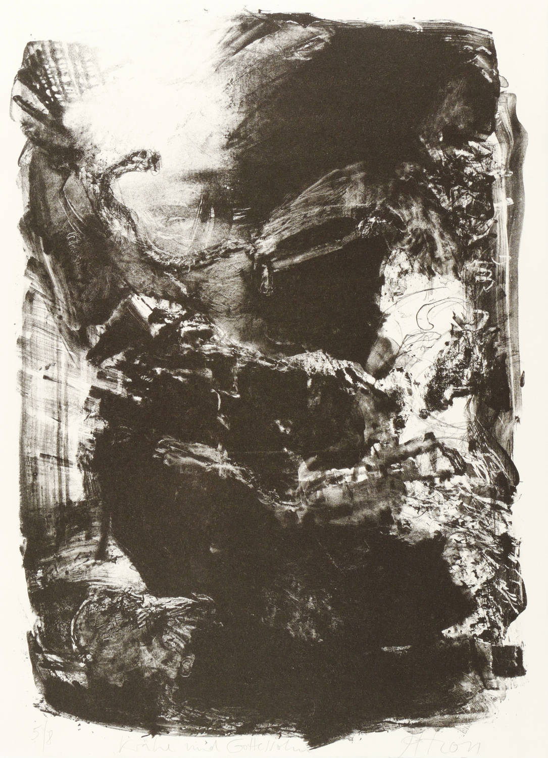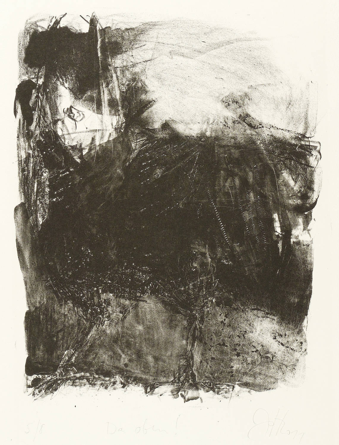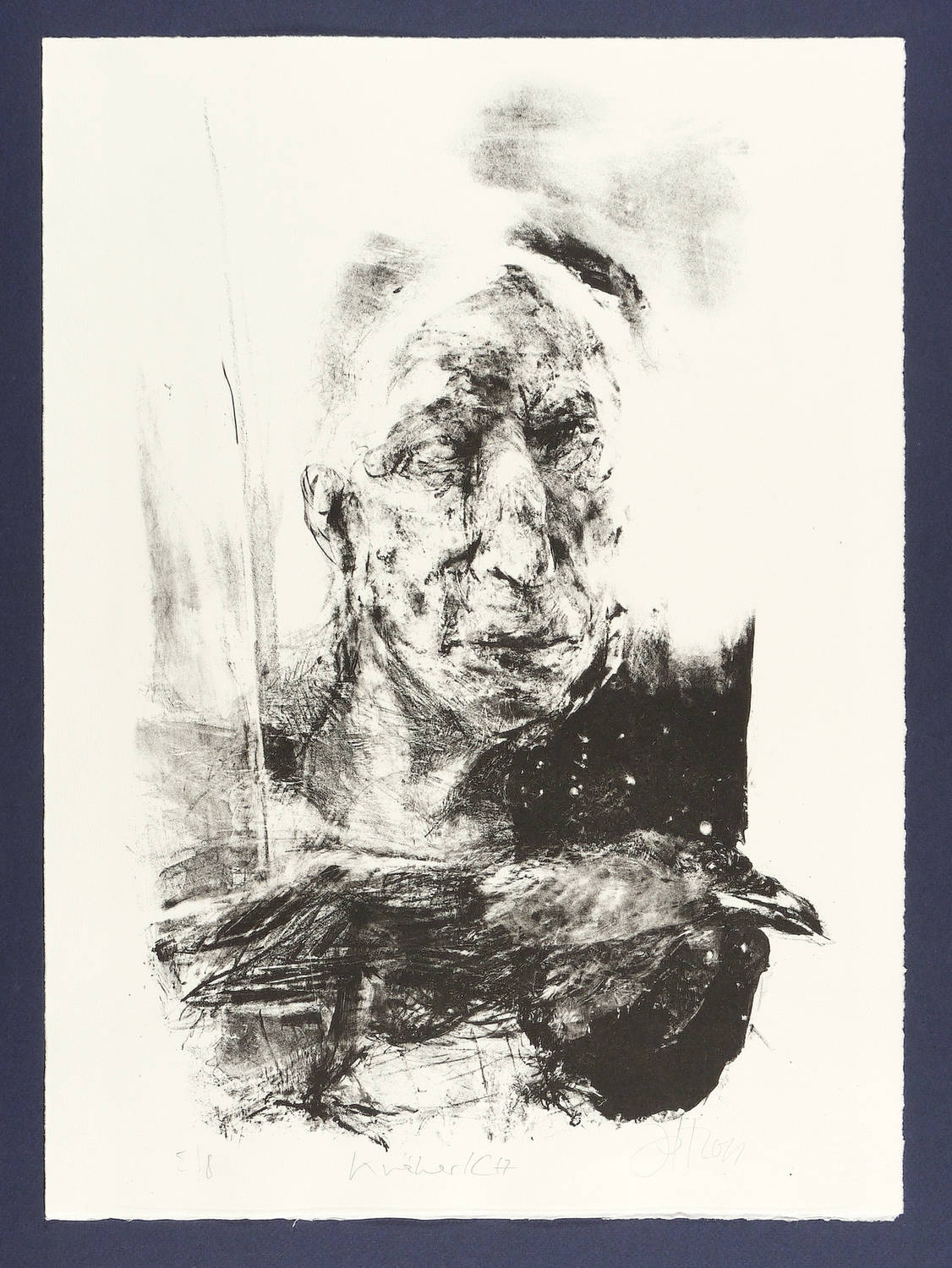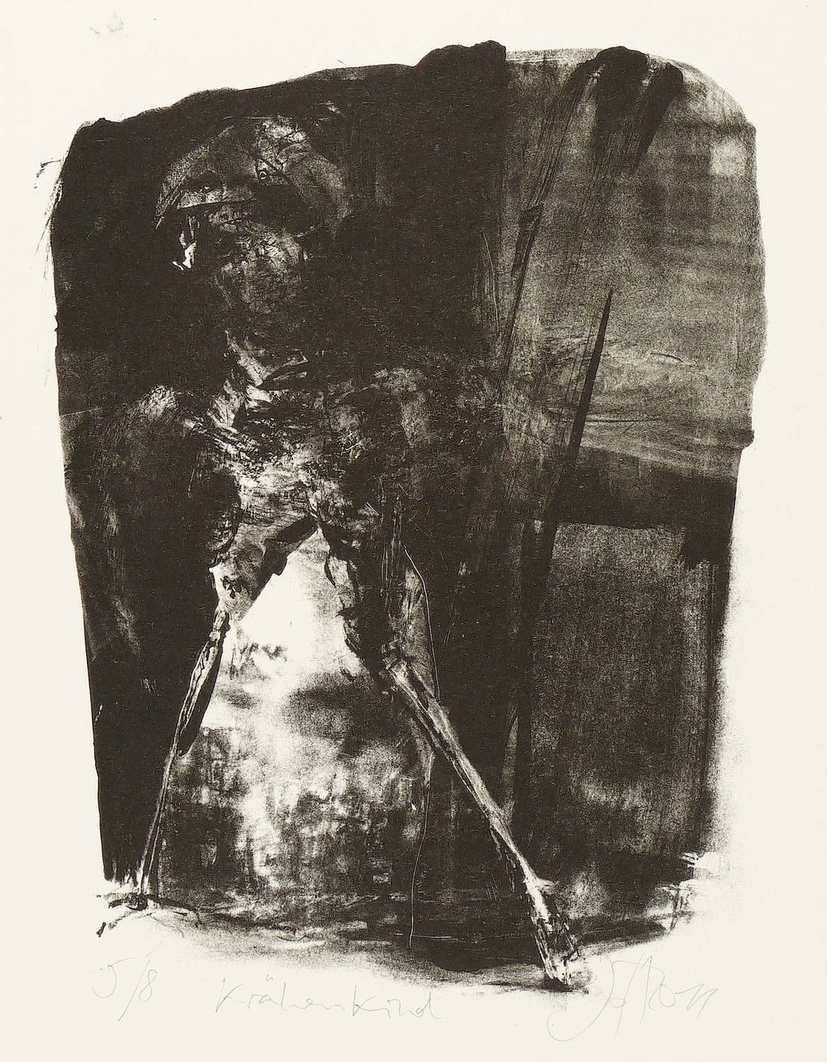 Jedes Blatt in Bleistift signiert und datiert. Dazu jeweils betitelt und nummeriert. – Zum Gedichtband ″Crow. From the Life and the Songs of the Crow″ (1970) des englischen Dichters Ted Hughes. - Herausragendes druckgrafisches Werk von Johannes Heisig. – Die einzelnen Blätter inklusive die leinengebundene Mappe in tadellosem Zustand.