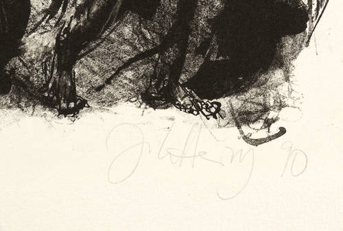 1990. Lithografie / Pinsel- & Kreidelithografie, in Schwarz, auf Hahnemühle-Bütten. – Originale Künstlergrafik, von Johannes Heisig. – Druckerexemplar. – 25,5 x 39,0 cm (Darstellung / Druckbild), 39,5 x 53 cm (Blatt).