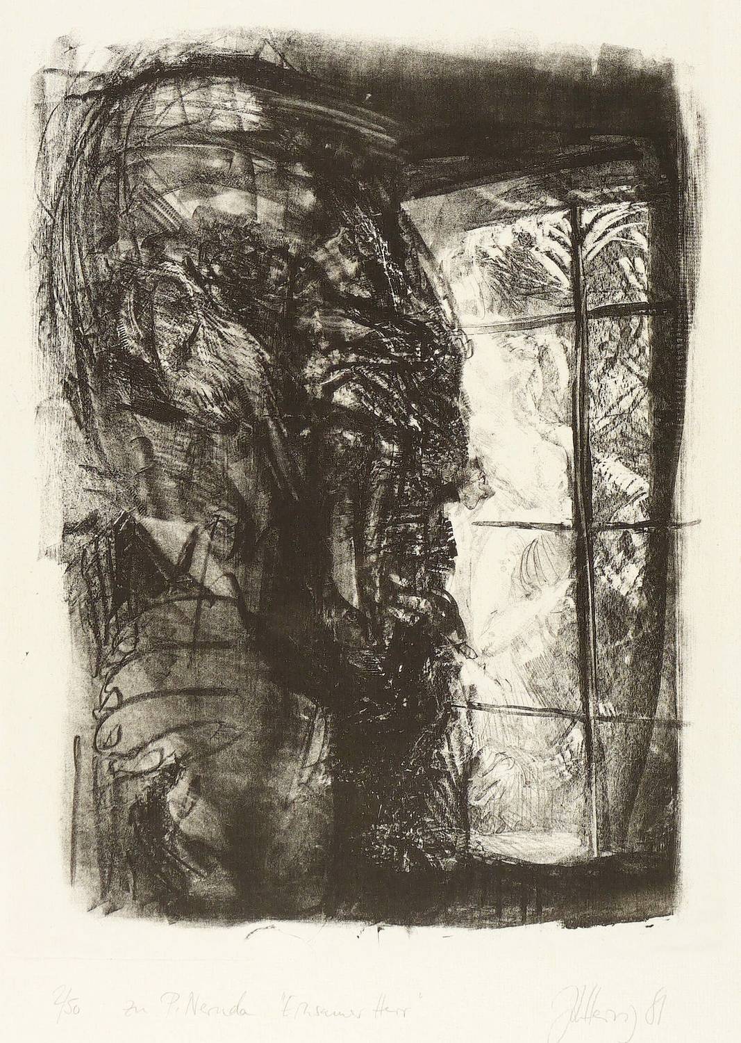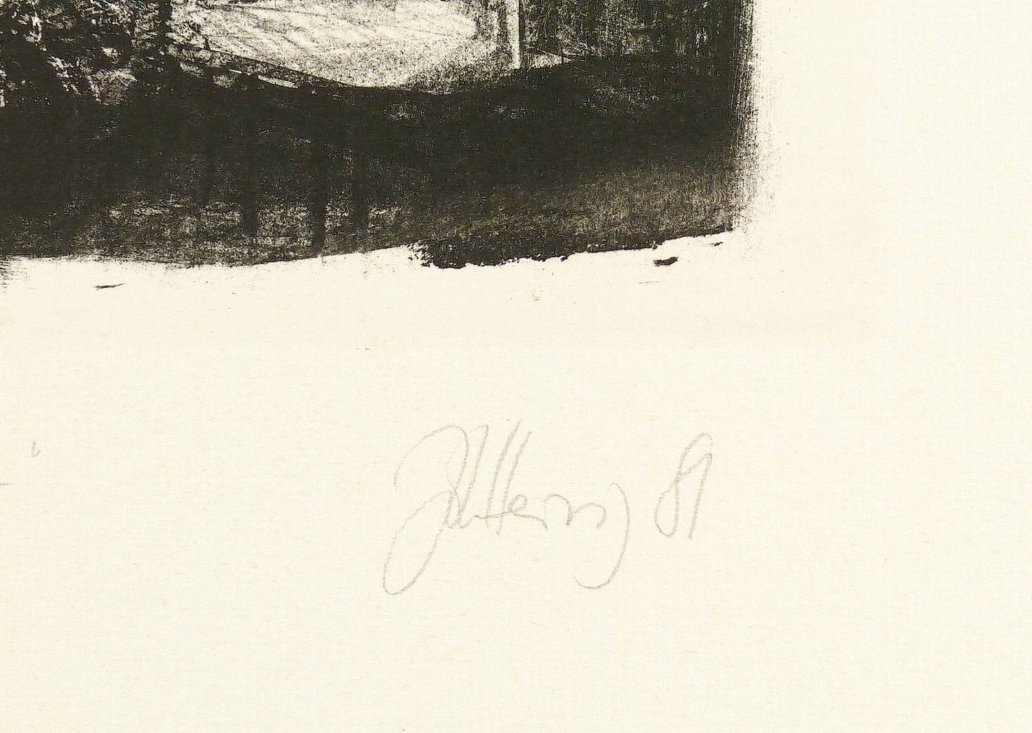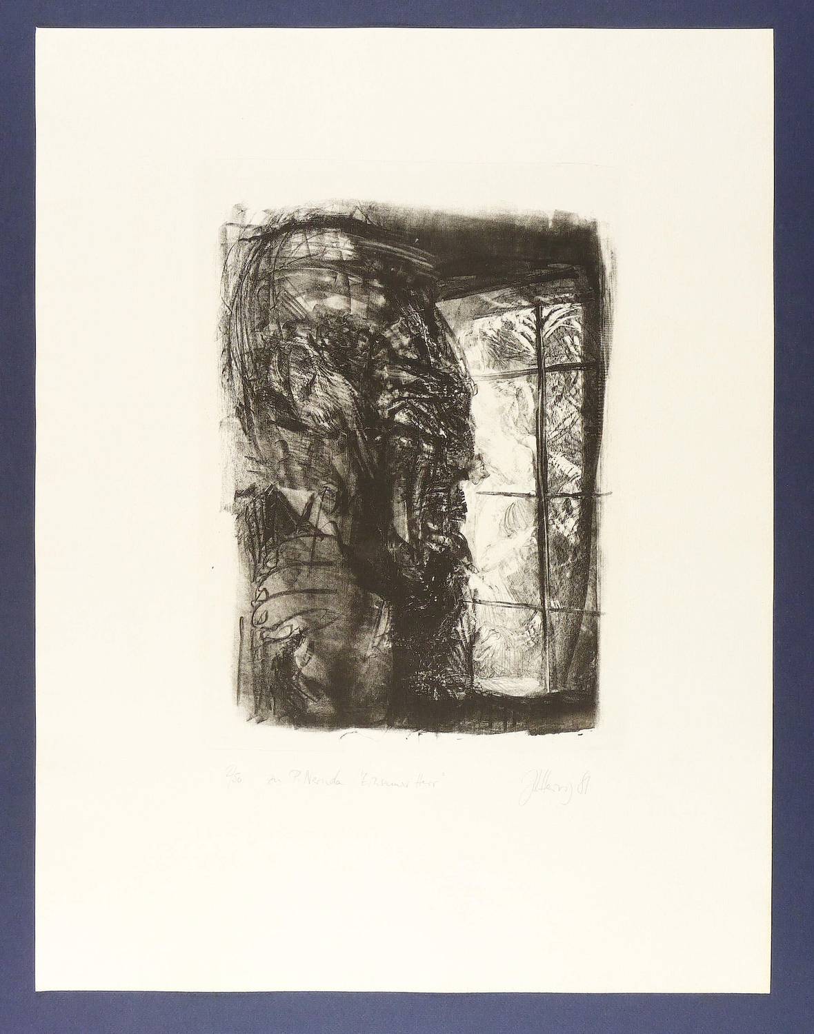 1981. Lithografie / Kreidelithografie, in Schwarz, auf hellgelbem Büttenpapier. – Originale Künstlergrafik, von Johannes Heisig. – Auflage Exemplar Nr. 2/50. – 36,1 x 27,2 cm (Darstellung), 39,5 x 30 cm (Stein), 65 x 50 cm (Blatt).