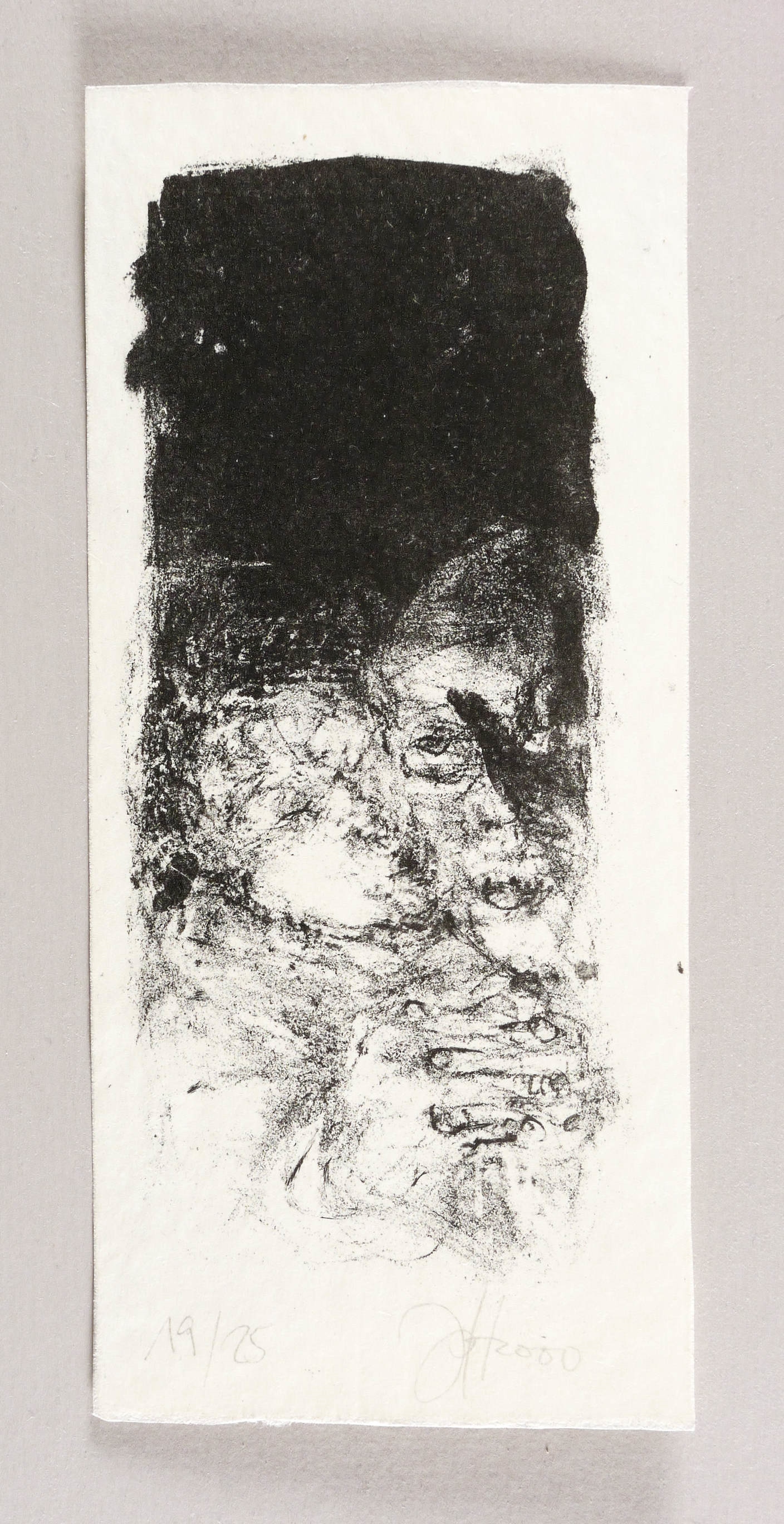2000. Lithografie / Kreidelithografie, in Schwarz, auf hellchamois Velin. – Originale Künstlergrafik, von Johannes Heisig. – Auflage Exemplar Nr. 19/25. – 18,0 x 8,1 cm (Darstellung / Druckbild), 22 x 10 cm (Blatt).
