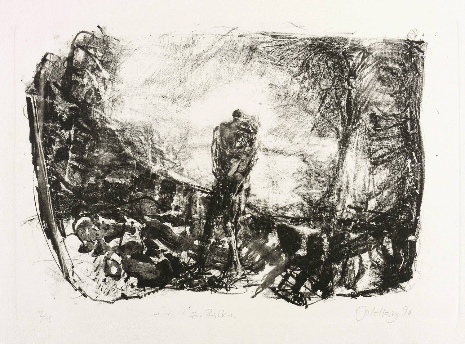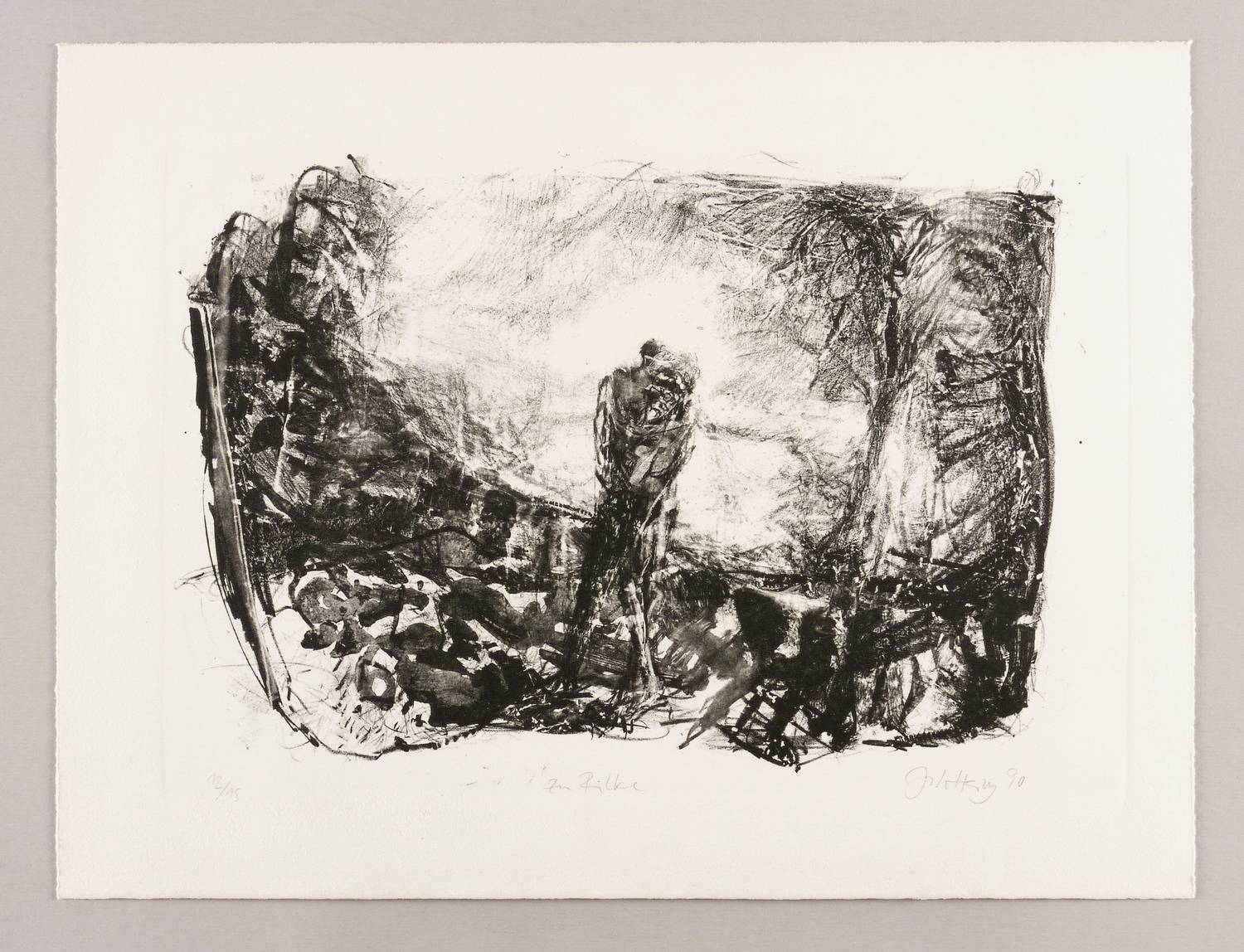 Rechts unten in Bleistift signiert und datiert: ″Joh Heisig 90″. Links Auflagenbezeichnung: ″12/15″. Mittig Titel: ″Zu Rilke″. – Originalrandig, unbeschnitten. Sehr guter Zustand.