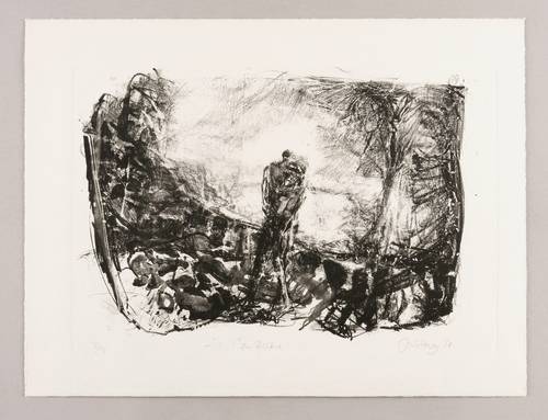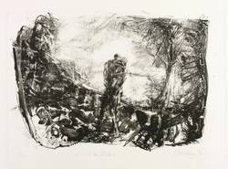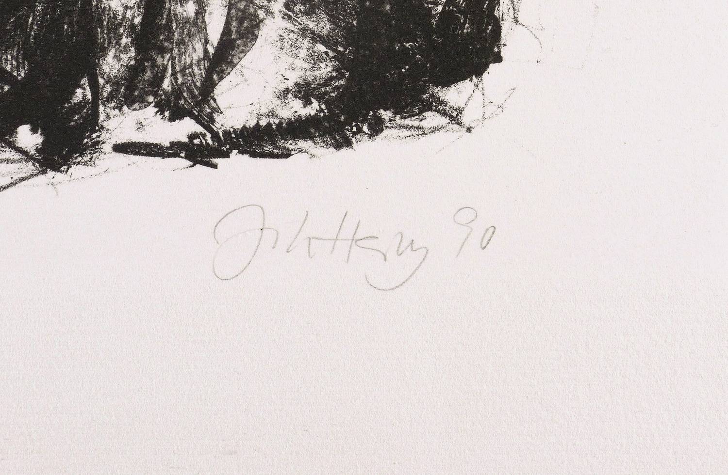 1990. Lithografie / Kreidelithografie, in Schwarz, auf festem weißem Zerkall. – Originale Künstlergrafik, von Johannes Heisig. – Auflage Exemplar Nr. 12/15. – 27,6 x 40,3 cm (Darstellung / Druckbild), 38 x 51 cm (Blatt).