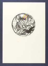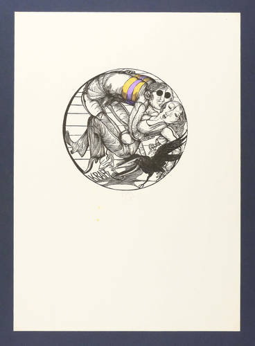 1973. Holzschnitt, in Schwarz, aquarelliert, auf feinem glattem Papier. – Originale Künstlergrafik, von Karl-Georg Hirsch. – 18,6 x cm (Darstellung / Durchmesser), 48 x 34 cm (Blatt).
