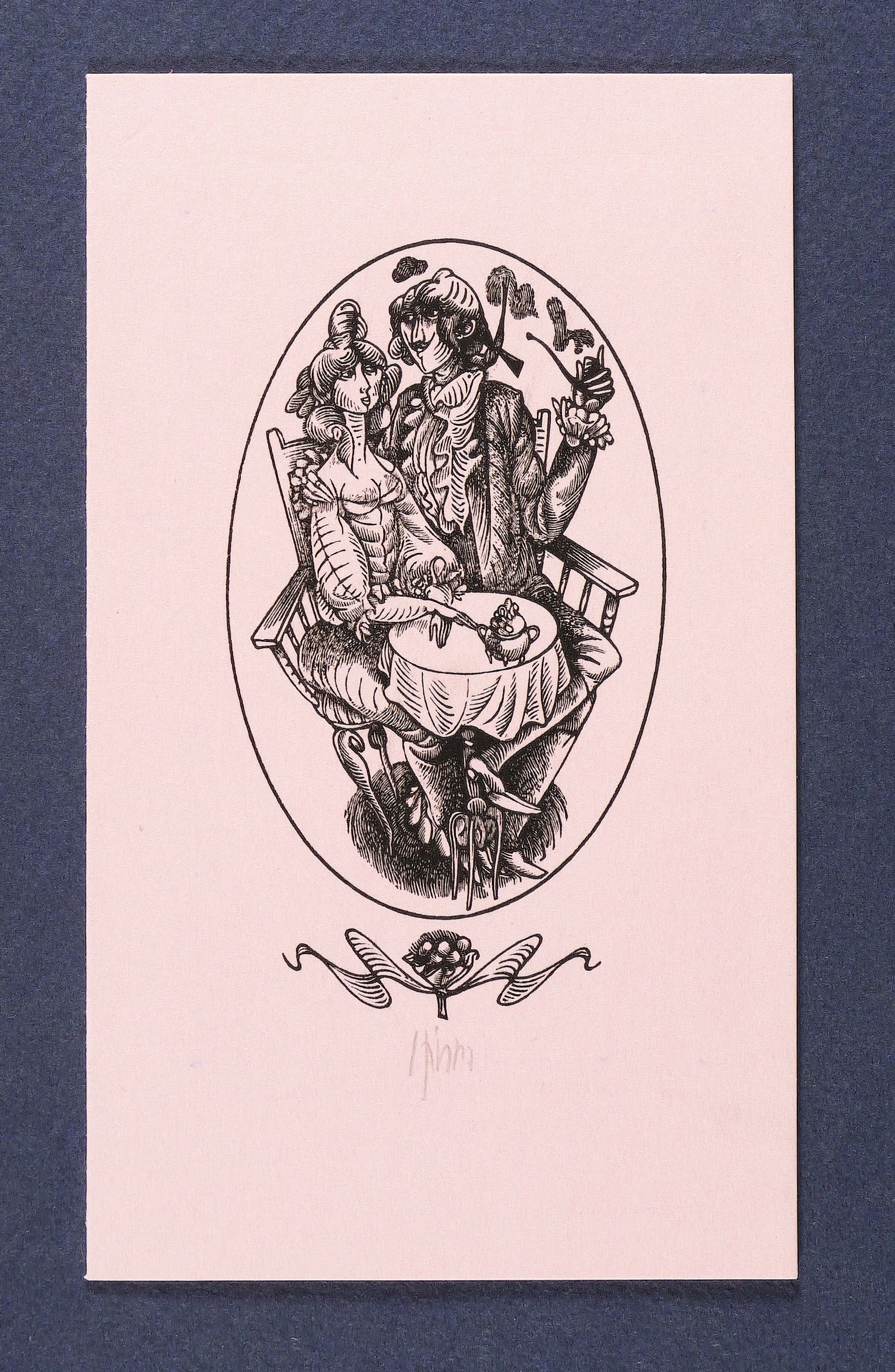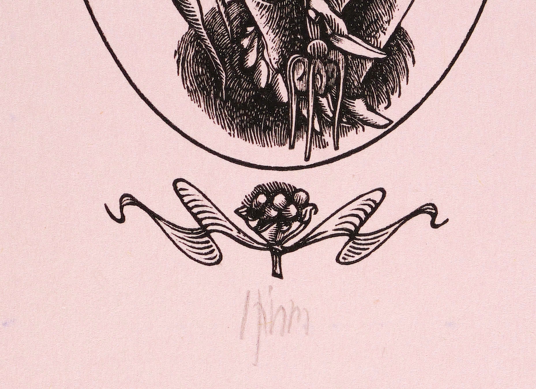 1970. Holzstich, in Schwarz, auf hellrosa Karton. – Originale Künstlergrafik, von Karl-Georg Hirsch. – 9,4 x 5,3 cm (Darstellung / Druckbild), 15 x 9 cm (Blatt).