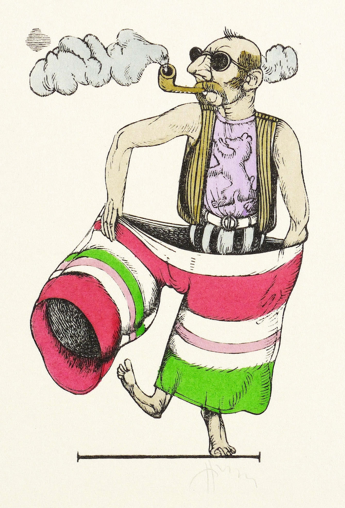 1973. Farbholzschnitt, in 7 Farben, auf weißem Karton. – Originale Künstlergrafik, von Karl-Georg Hirsch. – 7,9 x 5,2 cm (Darstellung / Druckbild), 13 x 10 cm (Blatt).