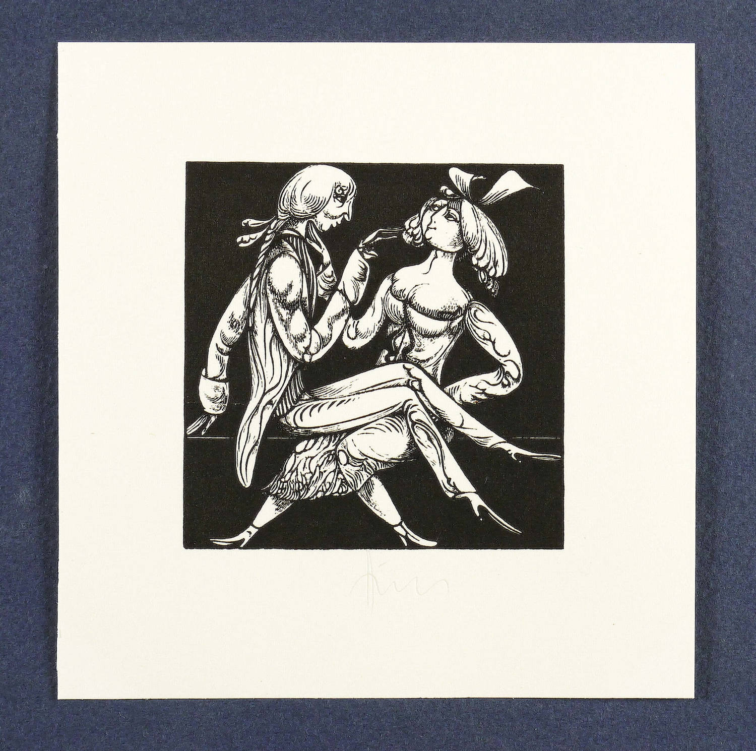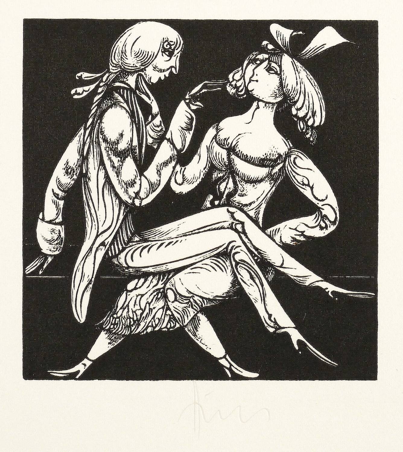 1974. Holzstich, in Schwarz, auf weißem Karton. – Originale Künstlergrafik, von Karl-Georg Hirsch. – 6,1 x 5,9 cm (Darstellung / Einfassungslinie), 11 x 10 cm (Blatt).