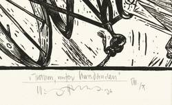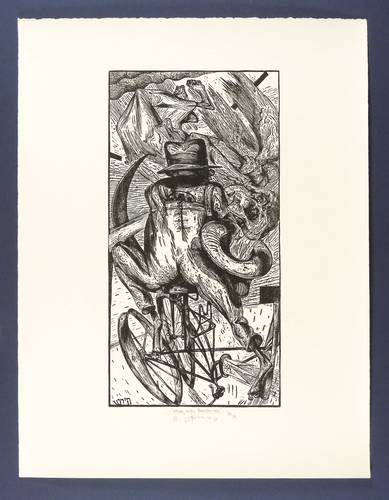 1996. Holzschnitt, in Schwarz, auf hellgelbem Büttenkarton. – Von Karl-Georg Hirsch. – Auflage Exemplar Nr. VIII/X. – 47,9 x 24,5 cm (Darstellung / Druckstock), 65,5 x 50 cm (Blatt).