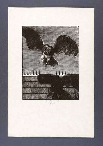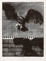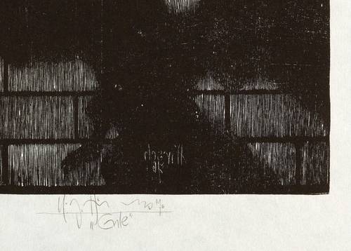 1976. Holzschnitt, in Schwarz, auf rauem weißlichem Japanbütten. – Originale Künstlergrafik, von Karl-Georg Hirsch. – 25,6 x 19,5 cm (Darstellung / Druckstock), 45 x 30 cm (Blatt).