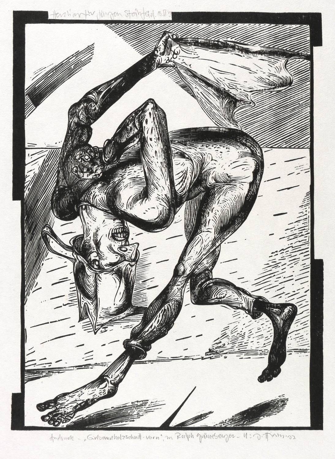 Unten rechts in Bleistift signiert und datiert. Links Auflagen- und Technikbezeichnung. Links oben persönliche Widmung des Künstlers an Jürgen Steinfeld. – Andruck bzw. Probedruck, als Einblattdruck ein Unikat. Sämtliche weiteren 200 Abzüge für Einbandgestaltung des Gedichtbandes verwendet: Ralph Grüneberger, Die Risse in der Liebe der Bewohner, Pfaffendorf: Pfaffendorfer Presse 1993. – Sehr gut erhalten.