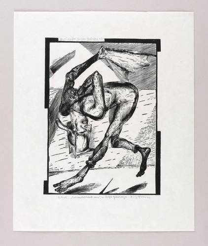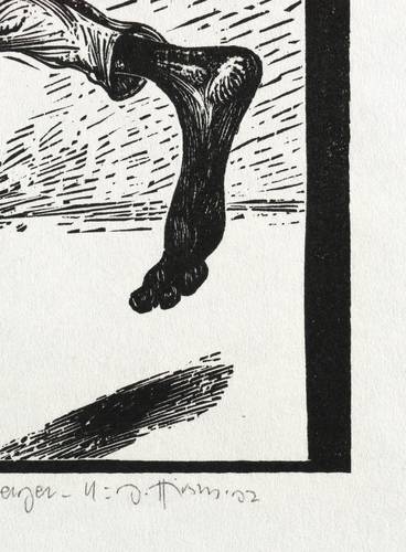 1992. Holzschnitt, in Schwarz, auf leichtem hellchamois Velin. – Von Karl-Georg Hirsch. – Andruck (Unikat). – 24,3 x 18,1 cm (Darstellung / Druckstock), 34 x 25 cm (Blatt).