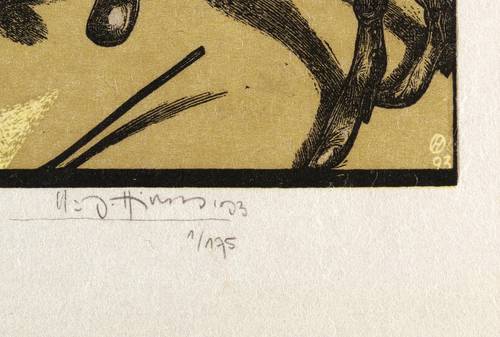 1993. Farbholzschnitt, in 3 Farben, auf feinstem Simili-Japan. – Von Karl-Georg Hirsch. – Auflage Exemplar Nr. 1/175. – 18,7 x 13,0 cm (Darstellung / Druckstock), 28 x 16 cm (Blatt).