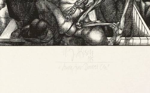 Karl-Georg Hirsch (*1938 Breslau, lebt und arbeitet bei Leipzig). Deutscher Grafiker. Lehre und Tätigkeit als Stuckateur. 1960-65 Studium an der Hochschule für Grafik und Buchkunst Leipzig (HGB). Ab 1965 freischaffend. 1967–70 Assistent an der HGB, seit 1970 Leiter der Werkstatt Holzschnitt, seit 1976 Dozent ebenda. 1981/82 Gastdozent für Holzschnitt und Holzstich an der finnischen Universität Jyväskylä. 1989 Berufung zum Professor für Grafik und Illustration an der HGB. 1990-97 Prorektor. Bekannt für seinen miniaturhaften, meisterhaft virtuosen Holzschnitt, den man in der DDR ob seiner extremen Schärfe und Kleinteiligkeit unrichtig als Holzstich bezeichnete.