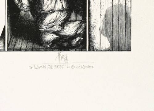 Unterhalb in Bleistift signiert und datiert: ″Hirsch 77″. Dazu bezeichnet: ″zu B. Brecht 'DIE MUTTER' 'Wie die Krähe'″. Oberhalb Widmung. – Originalrandiges Exemplar. Im linken Blattrand leichte Druckstellen. Insgesamt guter Zustand.