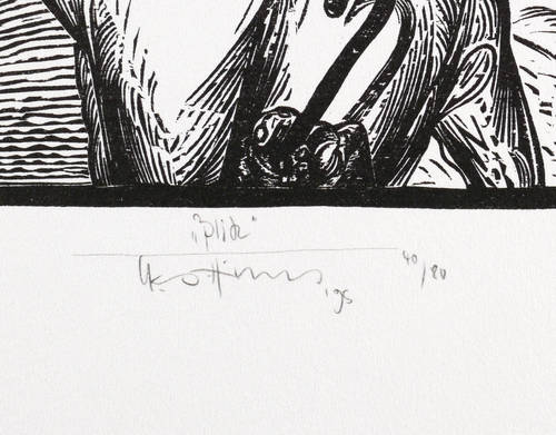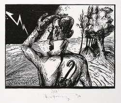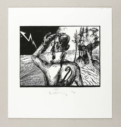 1995. Holzschnitt, in Schwarz, auf festem weißem Velin. – Von Karl-Georg Hirsch. – Auflage Exemplar Nr. 40/80. – 12,5 x 16,5 cm (Darstellung / Druckstock), 23 x 22 cm (Blatt).
