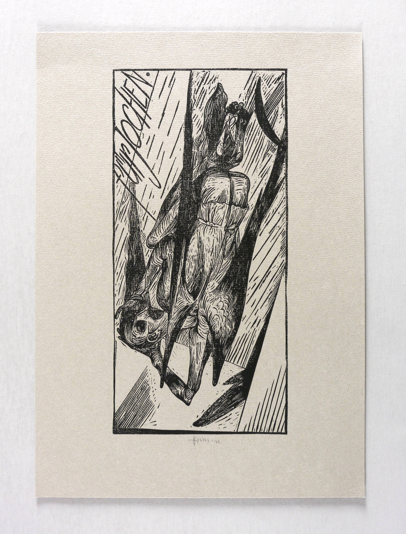 Aus: Blätter zu Literatur und Graphik. Für Jochen. Ein Dank an Hans-Joachim Walch (Leipzig: Leipziger Bibliophilen-Abend 1992), Bd. 18. – Unterhalb in Bleistift signiert und datiert: ″Hirsch 92″. Im Druckstock links oben Inschrift: ″für JOCHEN″. – Handdruck des Künstlers an der Hochschule für Grafik und Buchkunst Leipzig (HGB). – Sehr gut erhalten.