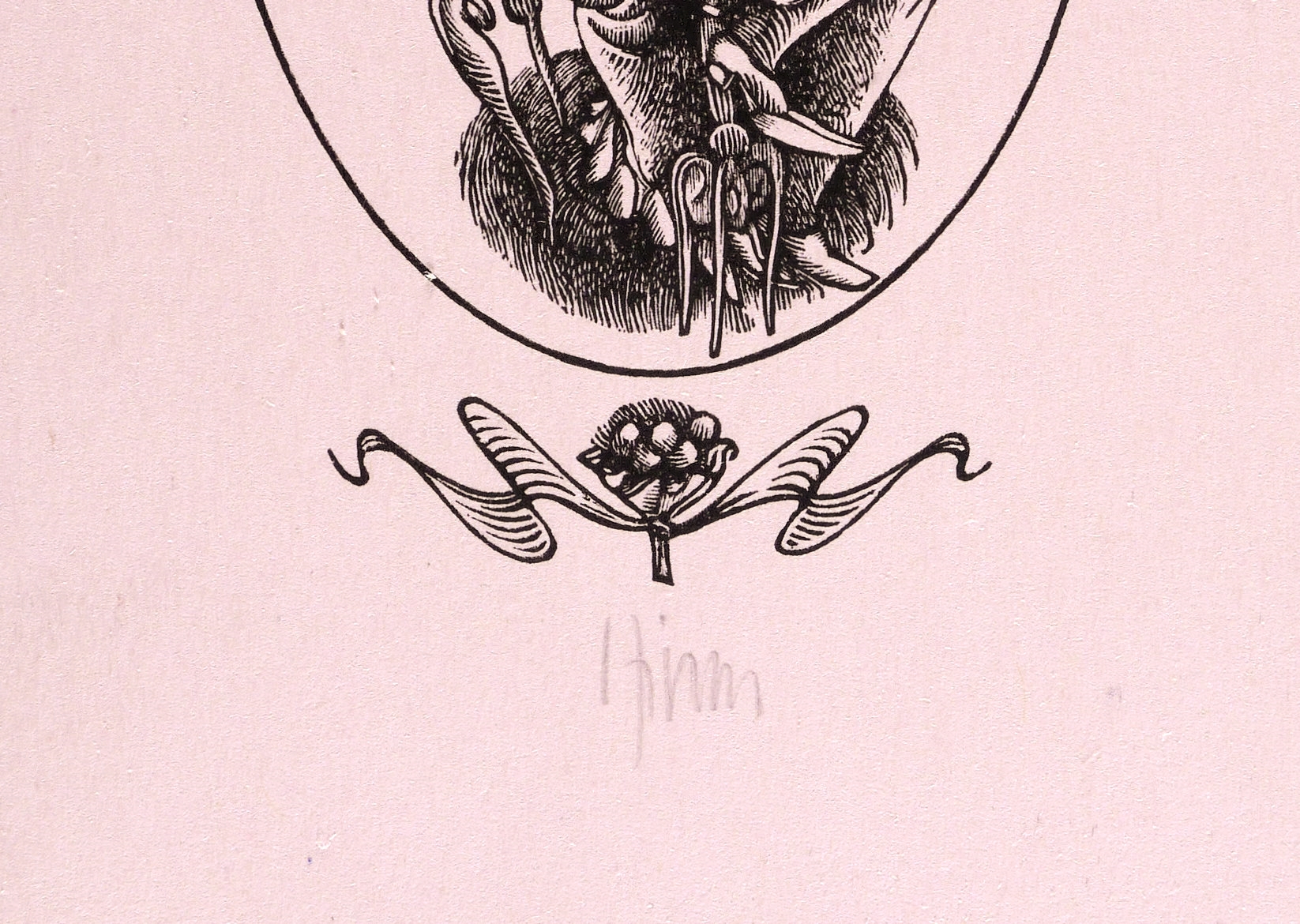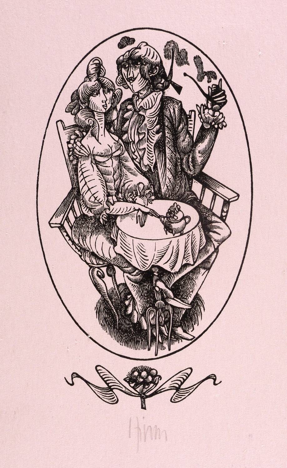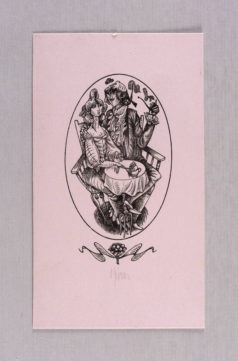 1970. Holzstich, in Schwarz, auf hellrosa Karton. – Originale Künstlergrafik, von Karl-Georg Hirsch. – 9,4 x 5,3 cm (Darstellung / Druckbild), 15 x 9 cm (Blatt).