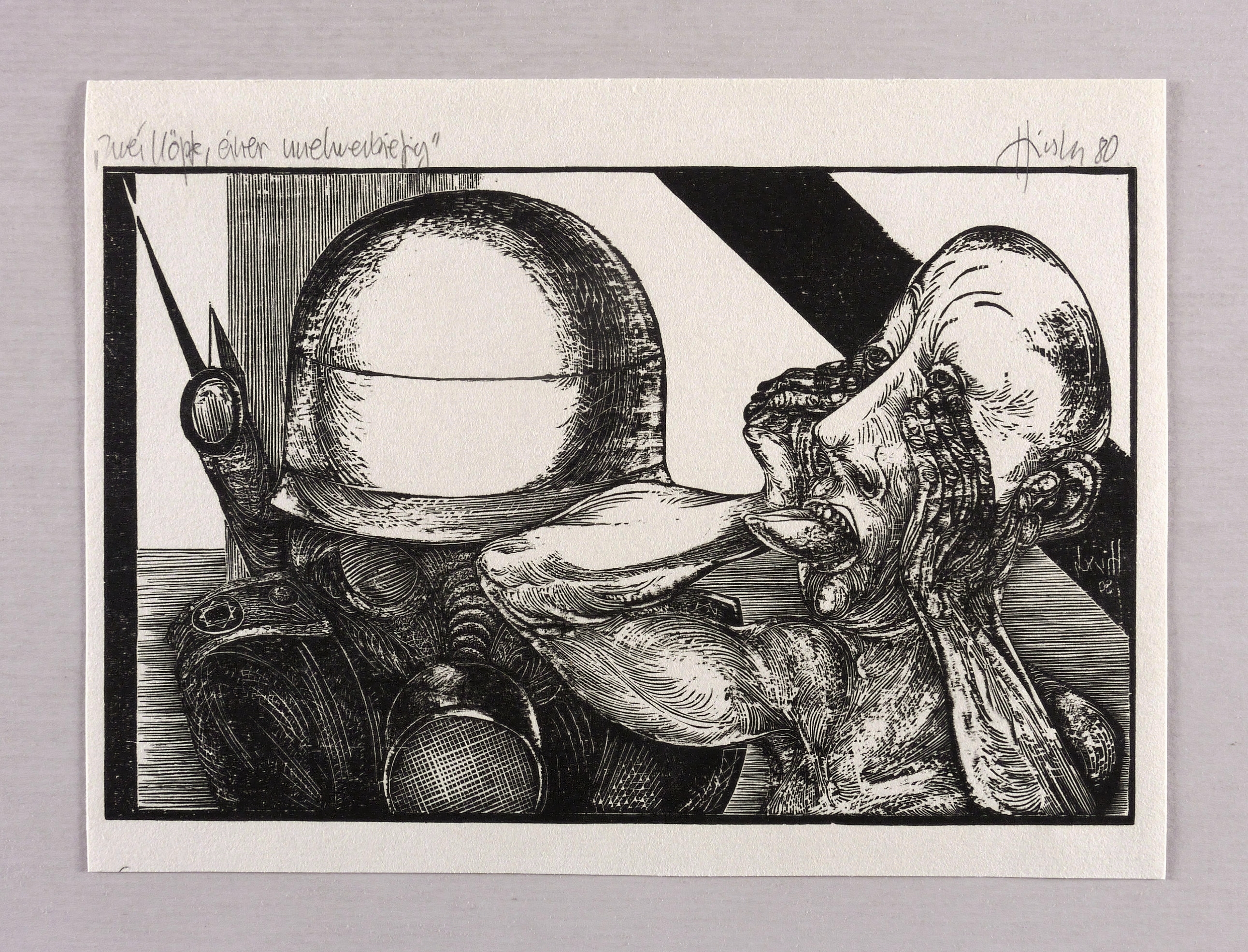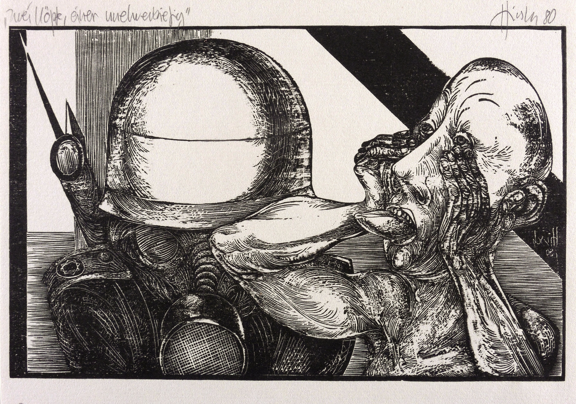 Rechts oben in Bleistift signiert und datiert: ″Hirsch 80″. Links Titel: ″Zwei Köpfe, einer unehrerbietig″. – Provenienz: Sammlung Gerlint Söder und Erhard Frommhold, Dresden. – Sehr guter Zustand.