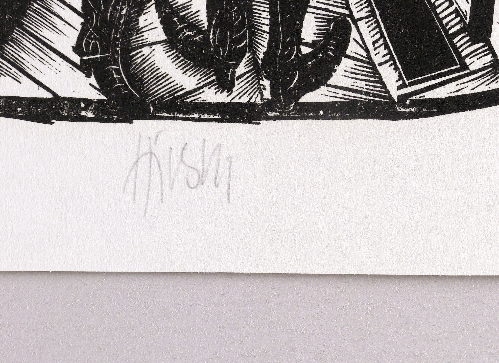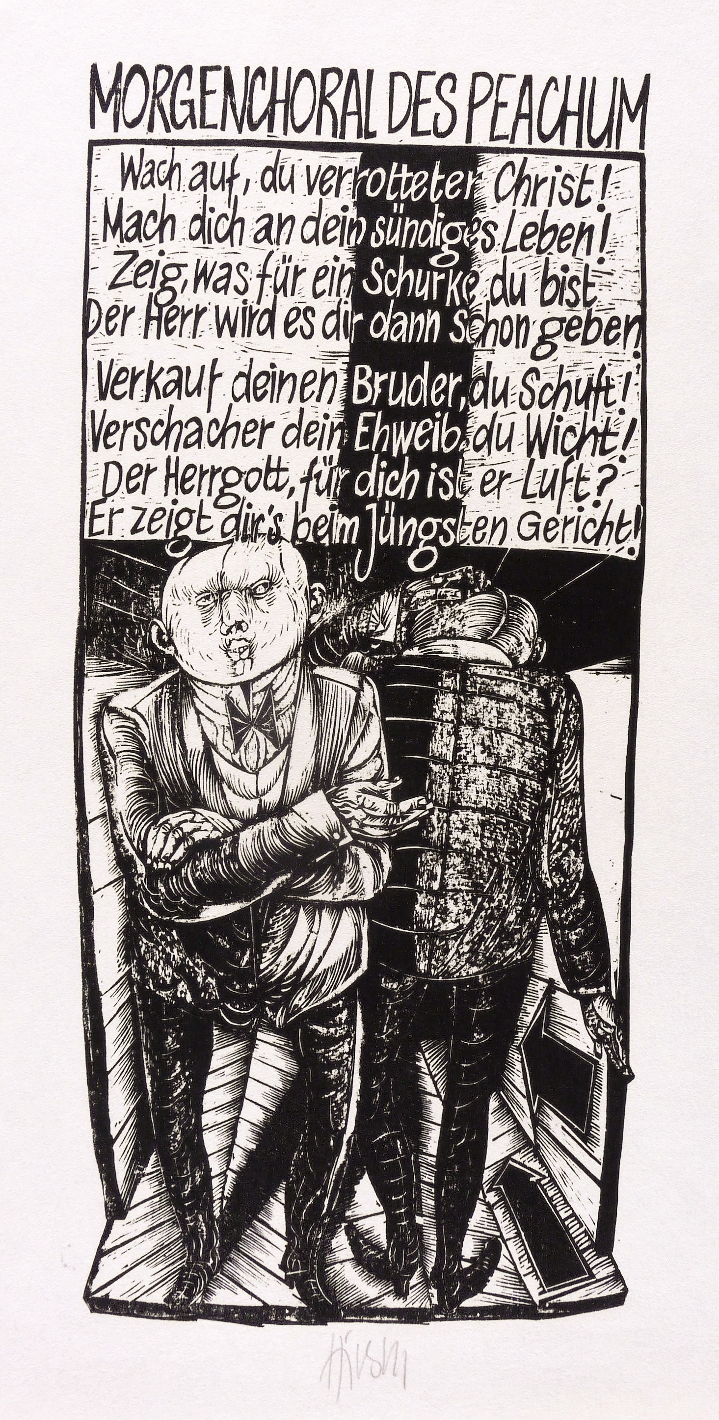 Aus: Karl-Georg Hirsch, Die Dreigroschenoper. 10 Holzschnitte (Leipzig: 1971). – Unterhalb in Bleistift signiert: ″Hirsch″. Im Druckstock Inschrift mit dem Liedtext und dem Titel: ″MORGENCHORAL DES PEACHUM″. – Exemplar aus einer Auflage für die Plauener Grafikgemeinschaft. – Sehr guter Zustand.