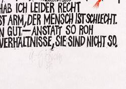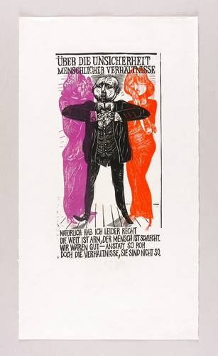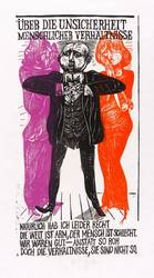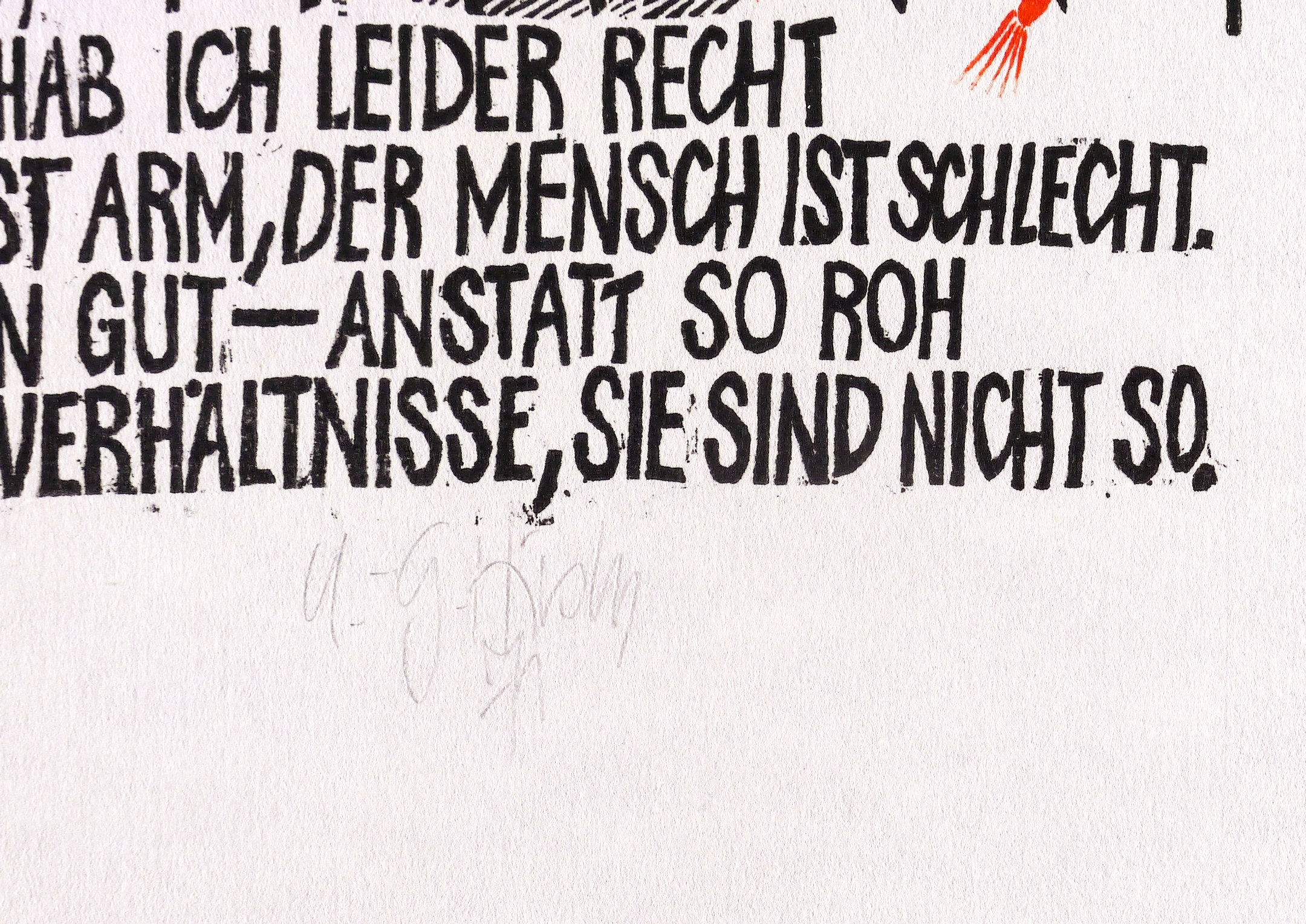 Aus: Karl-Georg Hirsch, Die Dreigroschenoper. 10 Holzschnitte (Leipzig: 1971). – Unterhalb in Bleistift signiert und datiert: ″K.-G. Hirsch 71″. Im Druckstock ober- und unterhalb Inschrift mit dem Liedtext und dem Titel: ″ÜBER DIE UNSICHERHEIT MENSCHLICHER VERHÄLTNISSE″. – Sehr guter Zustand.