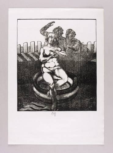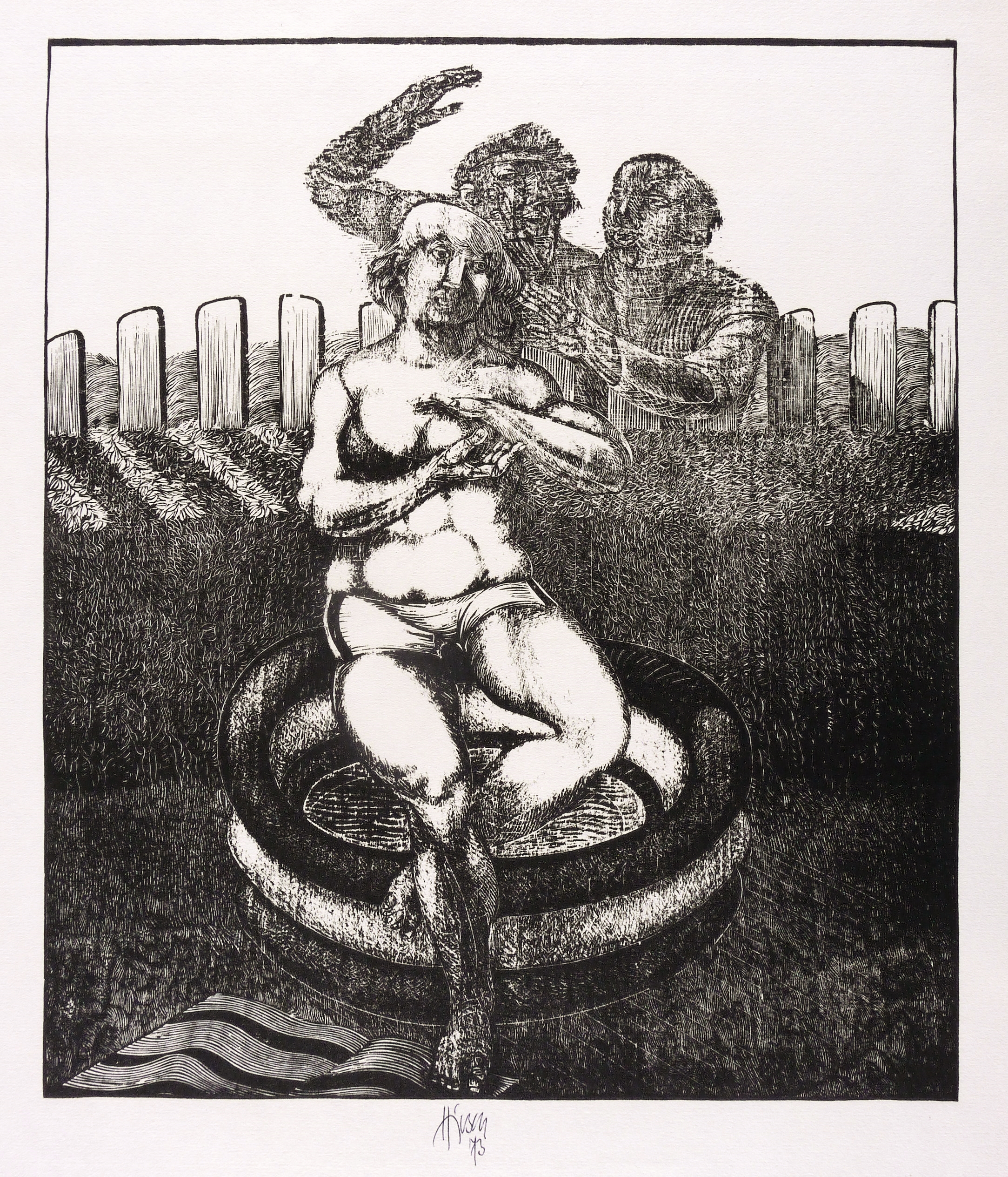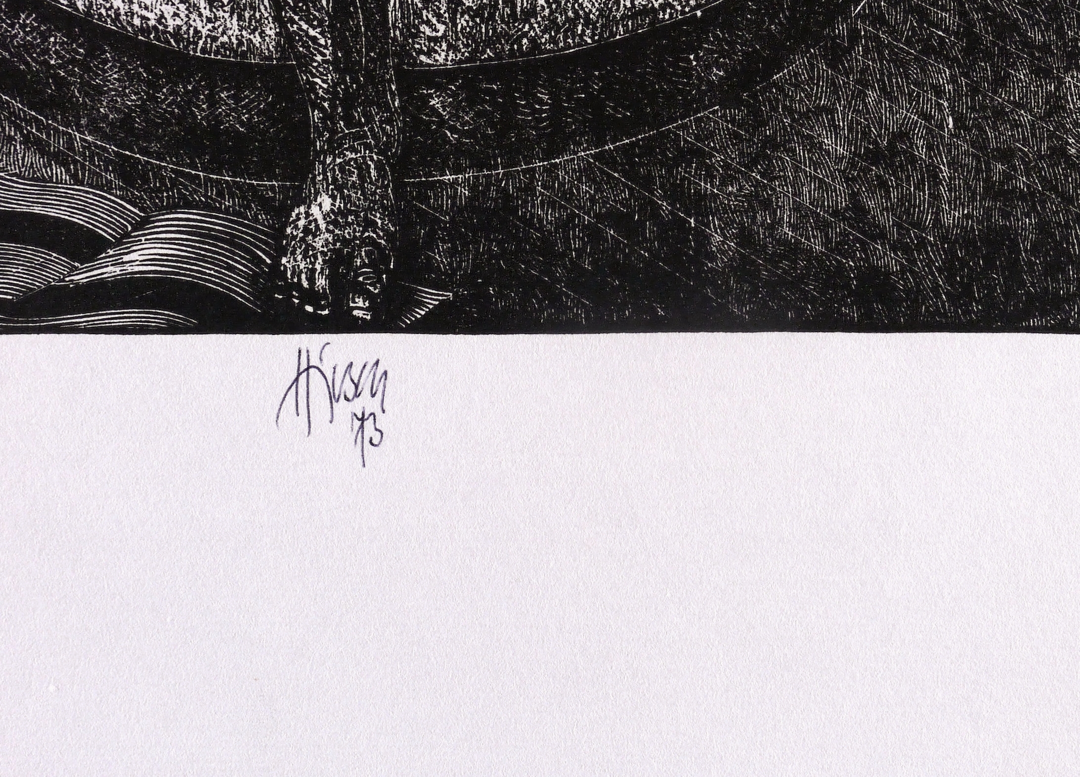 1973. Holzschnitt, in Schwarz, auf rauem weißlichem Simili-Japan. – Originale Künstlergrafik, von Karl-Georg Hirsch. – 32,4 x 28,0 cm (Darstellung / Druckbild), 48 x 34 cm (Blatt).