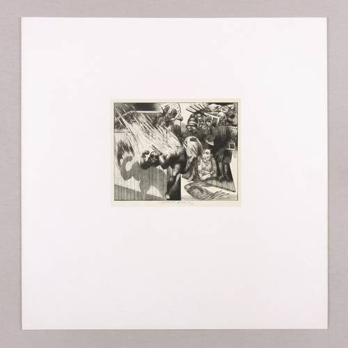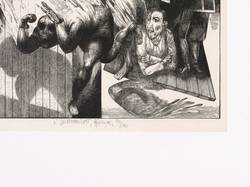 1979. Holzschnitt, in Schwarz, über beiger Tonplatte, auf glattem weißem Karton. – Originale Künstlergrafik, von Karl-Georg Hirsch. – Auflage Exemplar Nr. 36/200. – 11,2 x 14,1 cm (Darstellung / Einfassungslinie), 36 x 35 cm (Blatt).