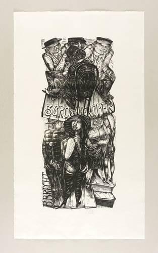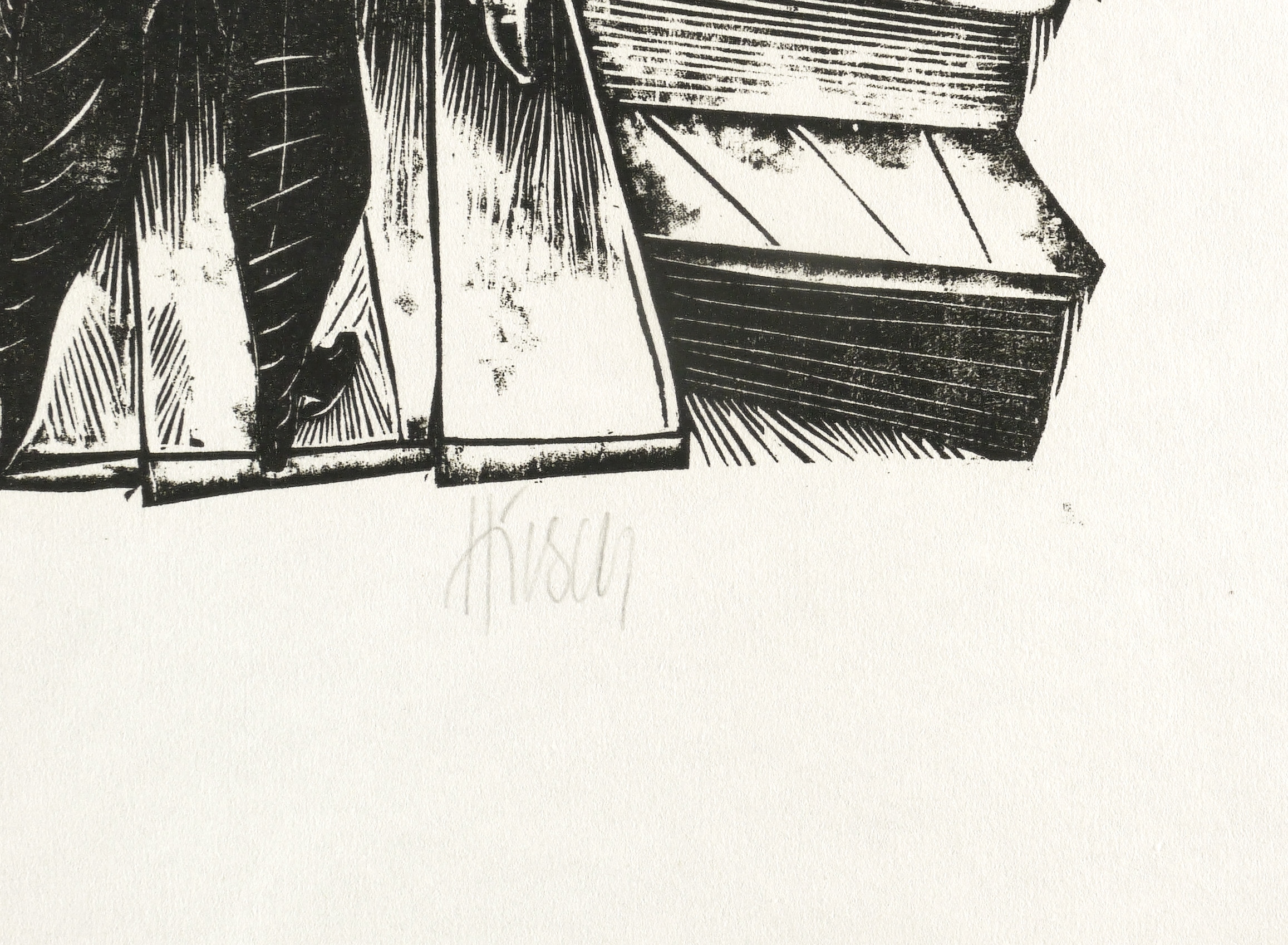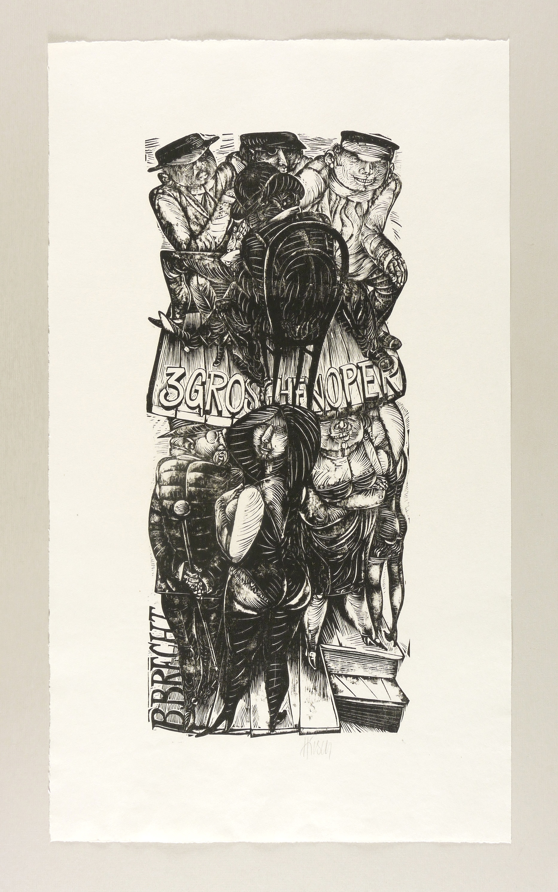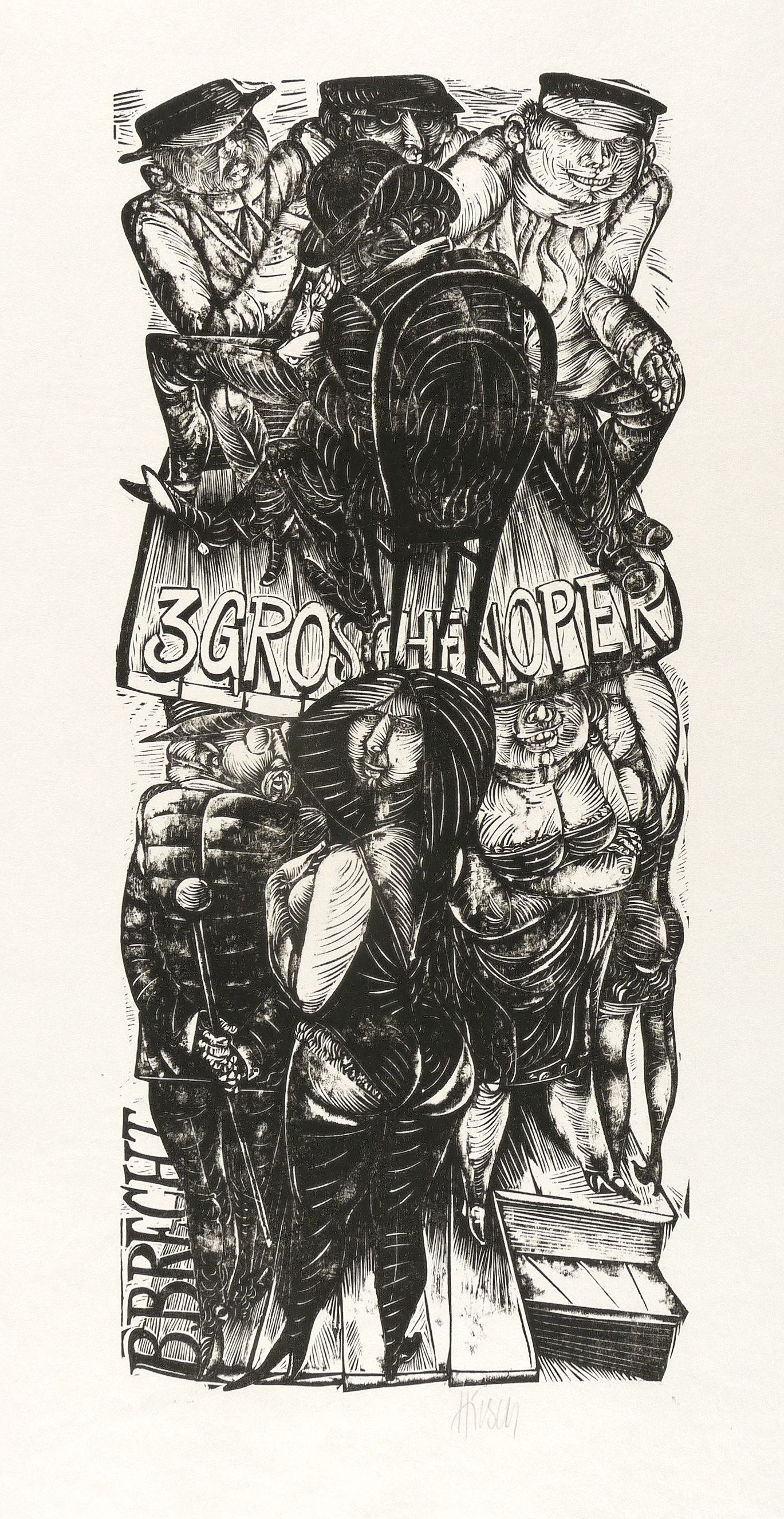 Aus: Karl-Georg Hirsch, Die Dreigroschenoper. 10 Holzschnitte (Leipzig: 1971). – Unterhalb in Kugelschreiber signiert und datiert: ″H.G. Hirsch 71″. Im Druckstock Inschrift: ″3GROSCHENOPER // BRECHT″. – Tadellos. Sehr guter Zustand.