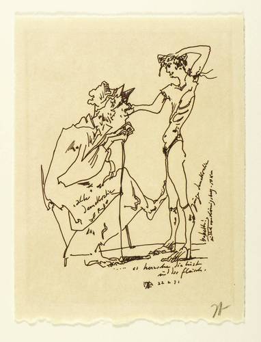 Horst Janssen (1929 Hamburg - 1995 Hamburg). Deutscher Zeichner, Grafiker, Illustrator. 1942 Tod der Mutter, Janssen wird als Halbwaise Schüler der Nationalpolitischen Erziehungsanstalt / NAPOLA in Haselünne, Emsland, wo der Zeichenlehrer Hans Wienhausen sein Talent erkennt und fördert. 1945 Aufnahme des 16-Jährigen bei seiner Tante in Hamburg. 1946-51 Kunststudium bei Alfred Mahlau an der Landeskunstschule Hamburg. Seit den 60er Jahren wuchs die Anerkennung seines Werkes, die sich bis in den internationalen Raum erstreckt. Er erhielt verschiedene Preise u.a. 1975 den Schiller-Preis der Stadt Mannheim. 1992 Verleih der Ehrenbürgerwürde der Stadt Oldenburg. Die ihm angebotene Professur lehnte Janssen ab. Im Neubau der Hamburger Kunsthalle befindet das Janssen-Kabinett. Im Jahr 2000 wurde das Horst-Janssen-Museum in Oldenburg eröffnet.